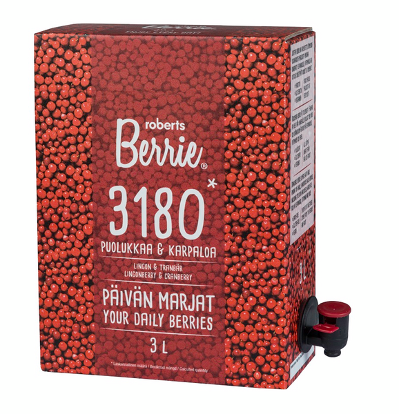 Vesi, murskattu kokonainen puolukka (21 %), murskattu kokonainen karpalo (10 %), makeuttava omenauute, rypäletäysmehu, sitruskuitu, luontainen aromi ja säilöntäaine (kaliumsorbaatti)