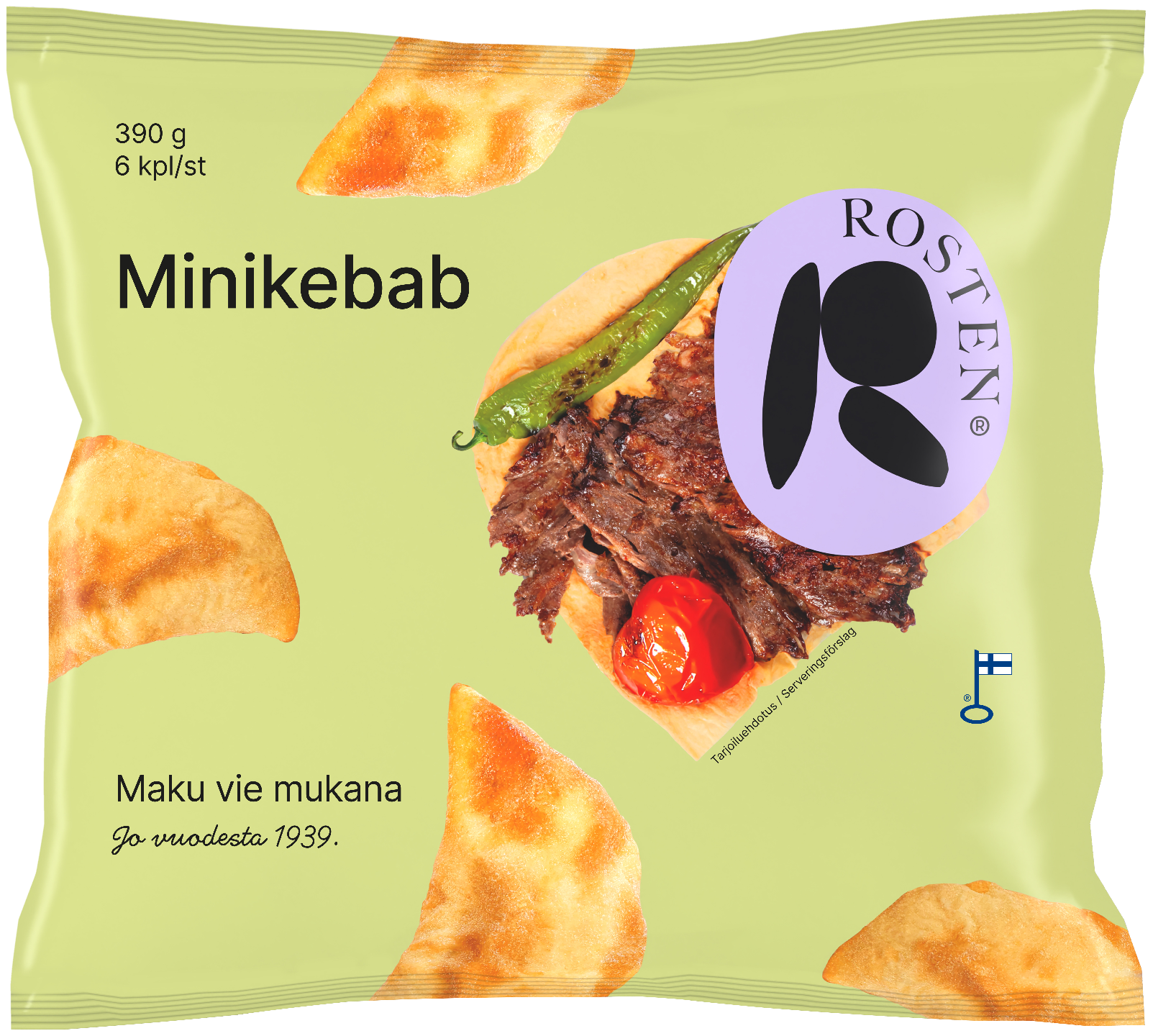 LaktoositonAito kebab minikoossa. Pitamaisen vehnäkuoren sisällä suomalaista naudanlihakebabia,riisiä ja mausteista tomaattikastiketta, jossa on sopivasti potkua.