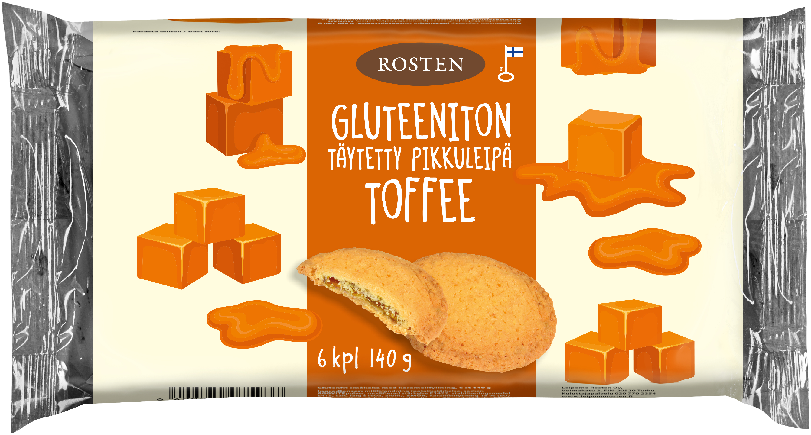 jauhoseos (perunatärkkelys, sokeri, MUNANVALKUAISjauhe, muunnettu tärkkelys E1422, stabilointiaine E415, suola, väri E160a, aromi), VOI, toffee täyte 18 % (EU) (sokeri, vesi, glukoosisiirappi, palmuöljy, muunneltu tärkkelys E1442, happamuudensäätöaineet (E333, E575), aromit, suola, värit (E150c, E160c), emulgointiaine E433, hyytelöimisaineet (E418, E401), säilöntäaine E202), sokeri, KANANMUNA (KANANMUNA, suola, happamuudensäätöaine E330, säilöntäaine E202, emulgointiaine E471), MANTELIjauhe, nostatusaine E503ii, happamuudensäätöaine E330.