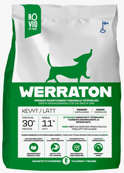 Werraton Kevyt täyttää kuluttajien pitkäaikaisen toiveen: vihdoinkin tarjolla on täysin kotimainen, kevyempi täysravinto aikuiselle koiralle. Ruoka on niin herkullista, että makunsa puolesta sitä voisi syödä vaikka kuinka paljon, mutta ruoan korkea proteiinipitoisuus lisää kylläisyyden tuntua ja auttaa koiran painonhallinnassa. Werrattomaan, tuttuun tapaan ruoassa on runsaasti tuoretta kananmunaa, mutta myös siipikarjaproteiinia, kuorittua kauraa, kuorittua härkäpapua ja pellavaa - kaikki laadukasta lähituotantoa Loimaalta!