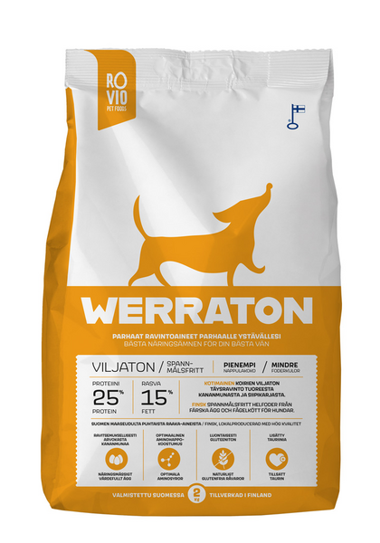 Werraton-koiranruoat on suunnitellut eläinten ruokinnan asiantuntija, joka huolehtii tuotteiden ravintoainekoostumuksesta ja sulavuudesta. Werraton Viljaton on herkkiä koiria ajatellen luontaisesti gluteeniton. Siinä on proteiinia 25 % ja rasvaa 15 %. Eläinproteiinipitoisuus on huikeat 82,4 %.