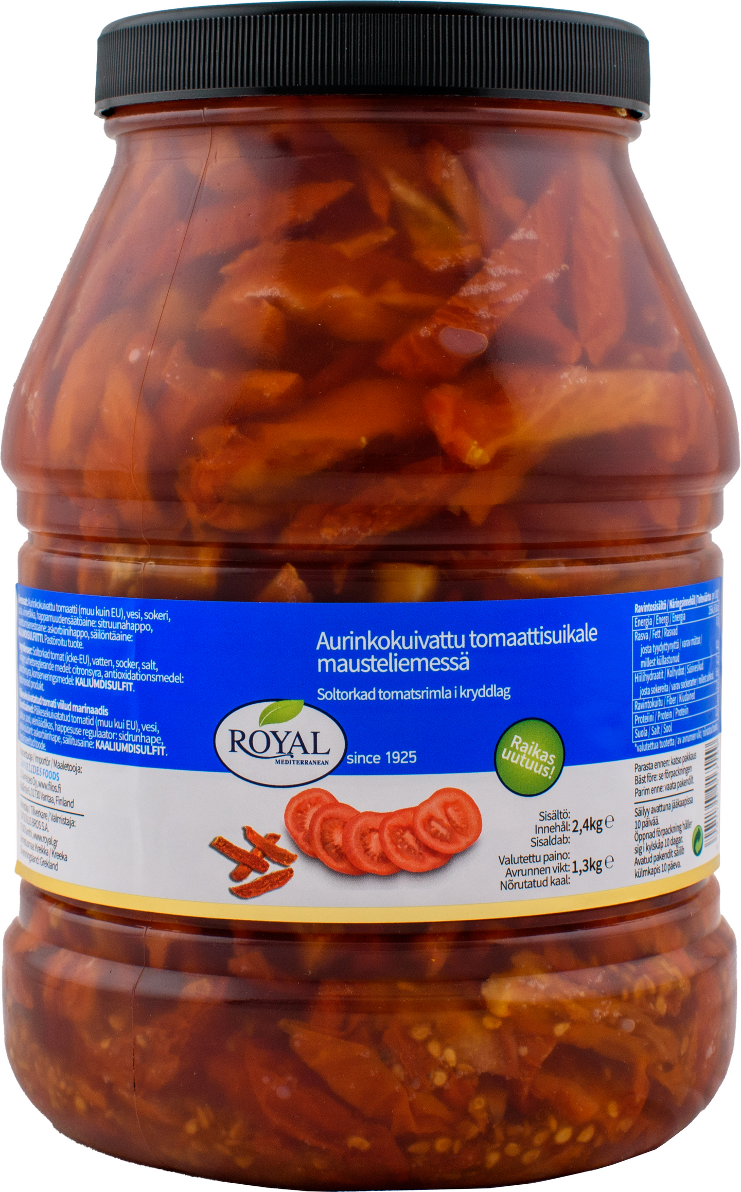 Royal aurinkokuivattu tomaattisuikale mausteliemessä 2,4kg/1,3kg