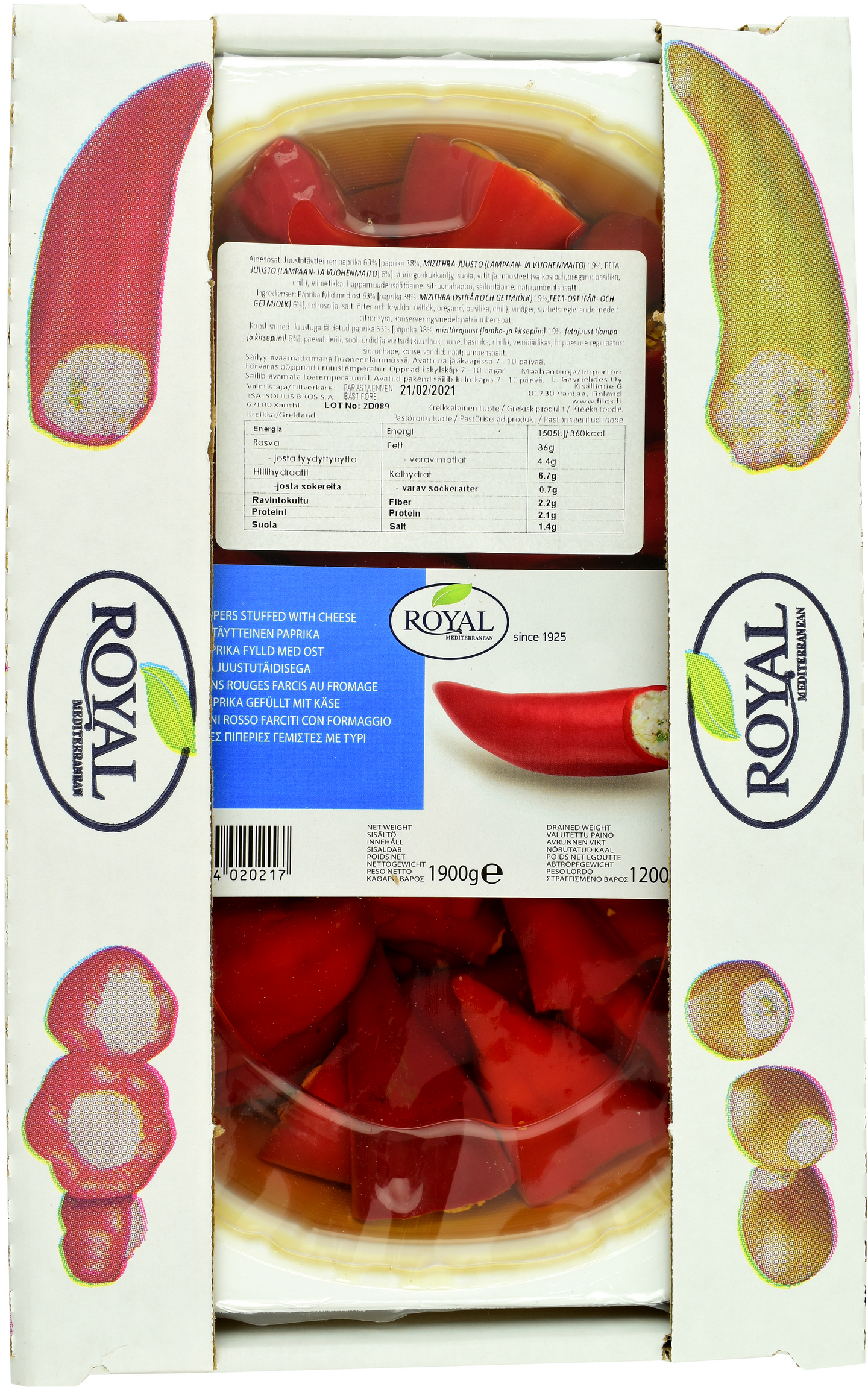 Juustotäytteinen paprika 63% [paprika 38%, MIZITHRA-JUUSTO (LAMPAAN- ja VUOHENMAITO) 19%, FETA-JUUSTO (LAMPAAN- ja VUOHENMAITO) 6%], auringonkukkaöljy, suola, yrtit ja mausteet (valkosipuli, oregano, basilika, chili), viinietikka, happamuudensäätöaine: sitruunahappo, säilöntäaine: natriumbentsoaatti.