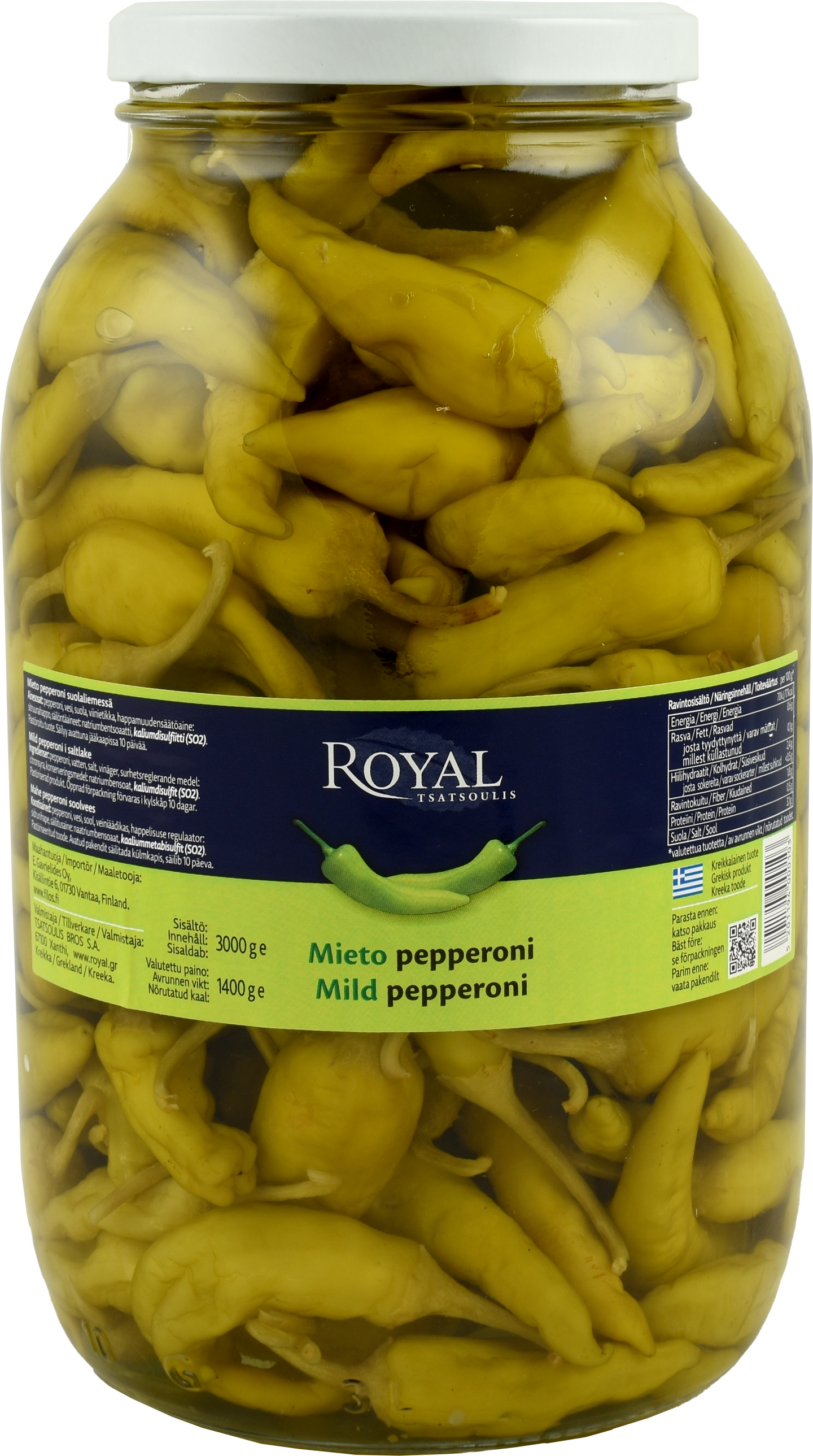 Pepperoni, vesi, suola, viinietikka, happamuudensäätöaine: sitruunahappo, säilöntäaineet: natriumbentsoaatti, KALIUMDISULFIITTI. Pastöroitu tuote.
