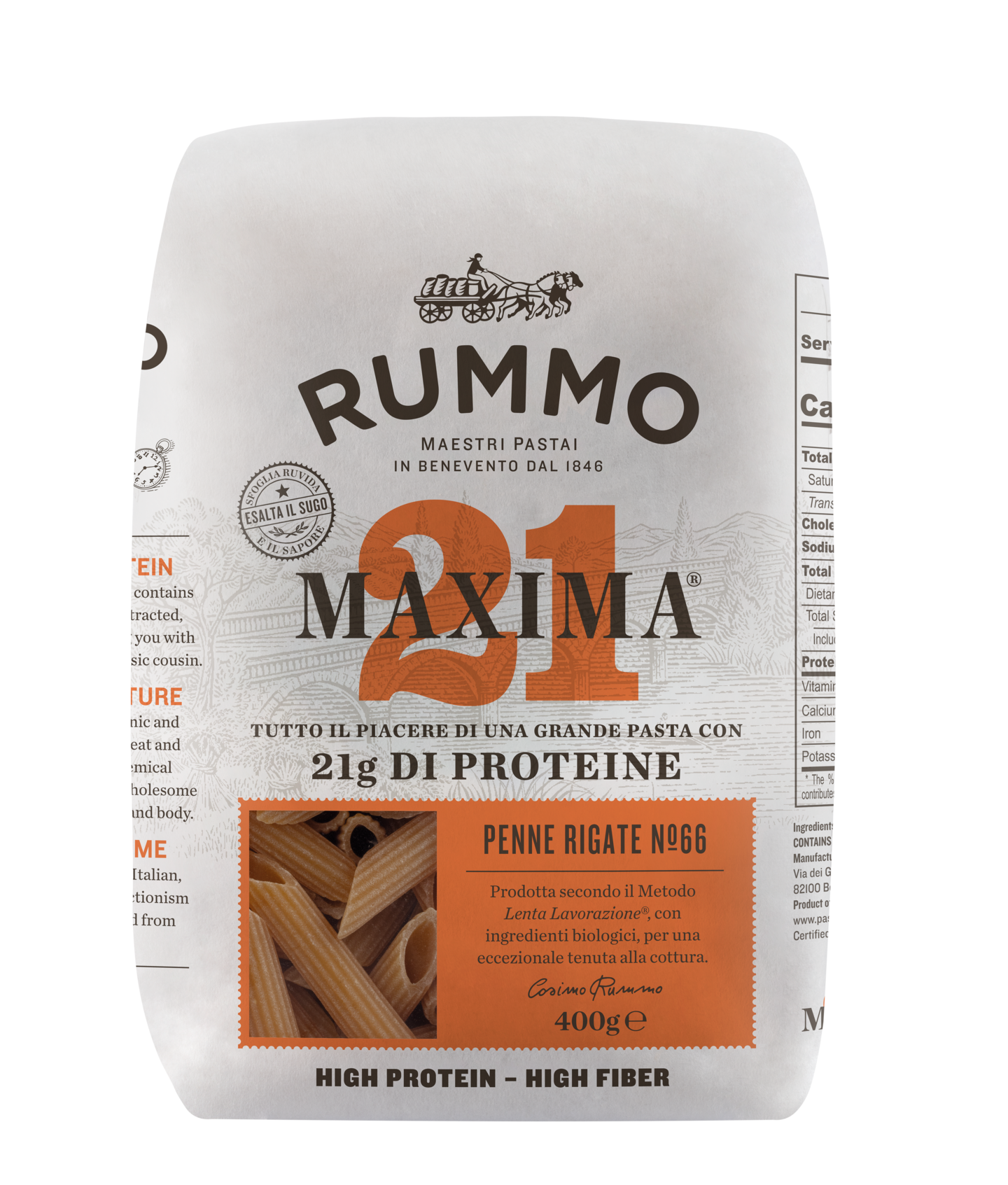 Rummon uusi Maxima-sarja sisältää 21 g proteiinia annosta kohden ja on valmistettu vain kahdesta luomuraaka-aineesta! Penne Rigate on yksi italialaisen keittiön monipuolisimmista ja käytetyimmistä muodoista. Uurrettu putkenmuotoinen pasta sopii täydellisesti kaikenlaisiin kastikkeisiin, klassikoista moderneihin ja luoviin tulkintoihin.