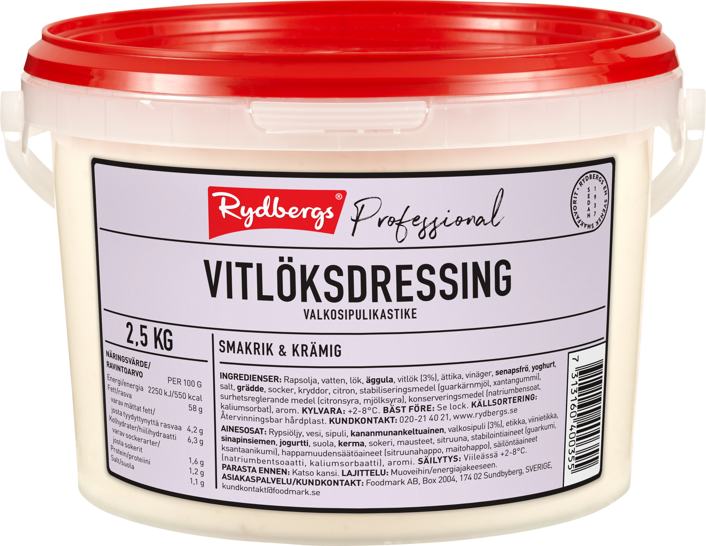 Rypsiöljy, vesi, sipuli, KANANMUNANKELTUAINEN, valkosipuli, etikka, viinietikka, SINAPINSIEMEN, JOGURTTI, suola, KERMA, sokeri, mausteet, sitruuna, stabilointiaineet (guarkumi, ksantaanikumi), happamuudensäätöaineet (sitruunahappo, maitohappo), säilöntäaineet (natriumbentsoaatti, kaliumsorbaatti), aromi. Voimakassuolainen.