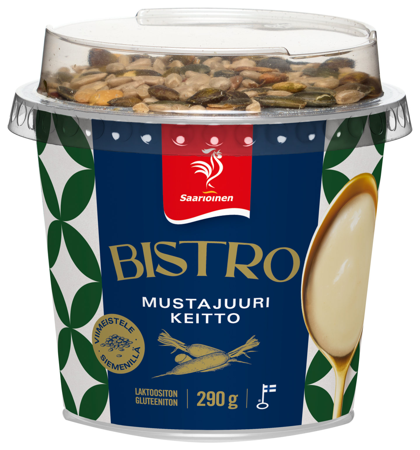 LaktoositonBistro-keitoissa jokainen lusikallinen on makukokemus! Keitimme ravintolatasoisen, kermaisen mustajuurikeiton. Kauniin vaalea ja samettinen mustajuurikeitto on maustettu mm. voilla ja valkopippurilla. Keitto viimeistellään ripotteella lisäämällä se höyryävän lämpimän keiton pinnalle. Ripotteessa on kurpitsan-, auringonkukan-, chian ja pellavansiemeniä. Keitto on laktoositon ja gluteeniton. Saarioinen on Suomen luotetuin valmisruokamerkki.