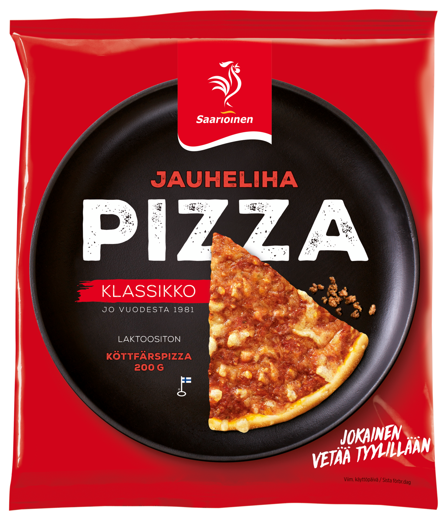 LaktoositonTämän klassikkopizzan täytimme sinulle täyteläisellä tomaattisella jauhelihakastikkeella. Tässä klassikossa pizzataikina on perinteisesti hiivalla kohotettu ja ihanan rapeaksi pizzauunissa paistettu. Näitä rakastettuja legendaarisia klassikkopizzoja olemme paistaneet jo vuodesta 1981. Saarioinen on Suomen luotetuin valmisruokamerkki.