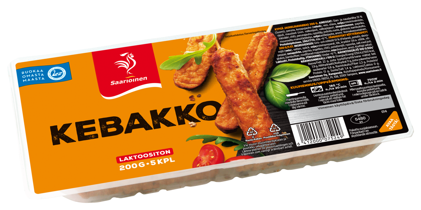 LaktoositonMeillä on taito hyppysissä valmistaa upeita ja herkullisia jauhelihavartaita eli kebakoita. Nämä klassikoksi muodostuneet kebakot maustoimme miedosti ja paistoimme huolella kauniin ruskeiksi. Saarioinen on Suomen luotetuin valmisruokamerkki.