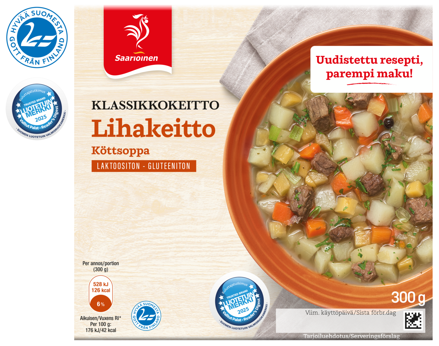 LaktoositonKeitimme täyteläisen, murean ja pitkään haudutetun lihakeiton perinteisen reseptin mukaan. Valitsimme huolella keittoon sopivat perunat, juurekset ja suomalaisen naudanlihan. Haudutettu liha on täyteläistä ja mureaa. Maukas liemi saa herkullisen maun perunasta, porkkanasta ja lantusta. Onko tämä lempikeittosi? Saarioinen on Suomen luotetuin valmisruokamerkki.