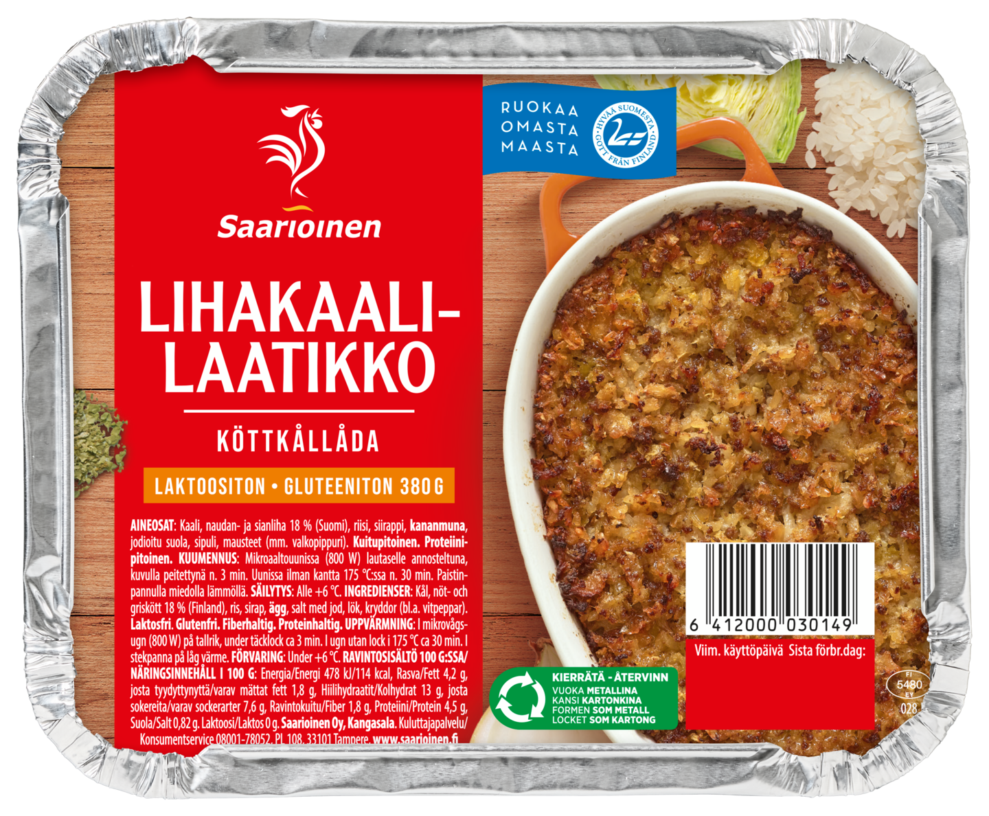 Valmistimme kaalista, suomalaisesta lihasta tehdystä jauhelihasta ja riisistä perinteisen, pitkään haudutetun kaalilaatikon, jonka viimeistelimme siirapilla. Meillä laatikon paistossa ei hätäillä, vaan pehmeän makuiset laatikot kypsyvät hitaasti uunissa paistajan valvovan silmän alla. Saarioinen on Suomen luotetuin valmisruokamerkki.