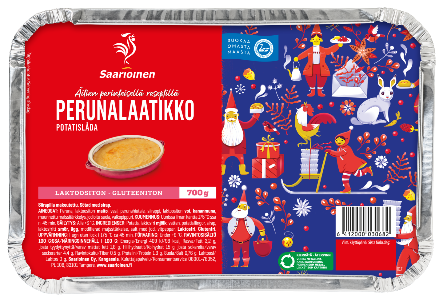 Valmistimme perinteisen täyteläisen makuisen perunalaatikon paistamalla sen pitkään uunissa. Valitsimme siihen huolella perunat, maustoimme sen juuri oikealla määrällä siirappia ja laitoimme siihen nokareen oikeaa voita. Perunalaatikko on joulun kausituote. Meillä laatikon paistossa ei hätäillä, vaan pehmeän makuiset laatikot kypsyvät hitaasti uunissa paistajan valvovan silmän alla. Saarioinen on Suomen luotetuin valmisruokamerkki. Tuotetta myydään sekä tuoreena että pakasteesta sulatettuna, jolloin kannessa on maininta pakastuksesta. Sulatettua tuotetta ei saa pakastaa uudelleen.