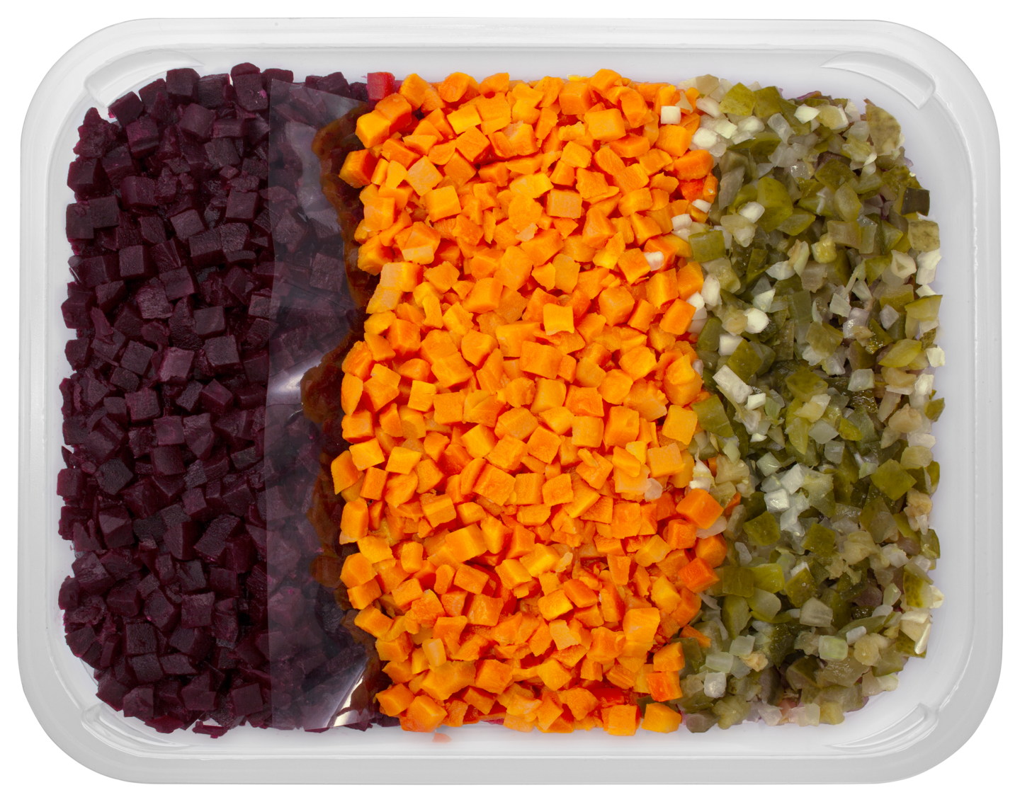 VegaaninenPerinteinen, herkullinen rosolli valmistetaan punajuuresta, porkkanasta, kurkusta ja sipulista. Raaka-aineet ovat omina, siisteinä raitoinaan rasiassa.