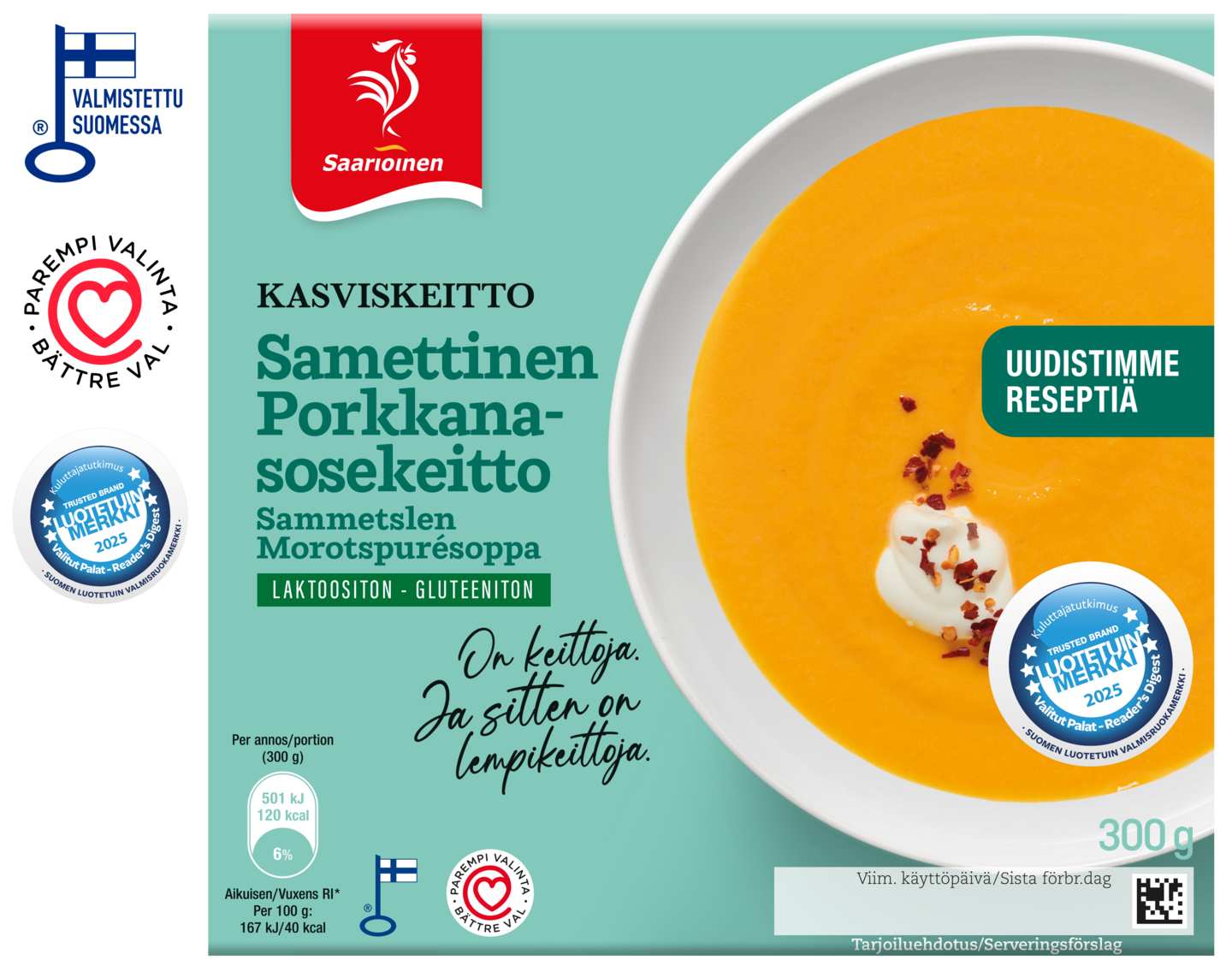 LaktoositonKeitimme pehmeän kermaisen ja kauniin värisen sosekeiton porkkanasta, juuriselleristä ja sipulista. Huolellisesti valitut raaka-aineet varmistavat herkullisen lopputuloksen. Tässä keitossa on sydämellinen maku. Onko tämä lempikeittosi? Saarioinen on Suomen luotetuin valmisruokamerkki.