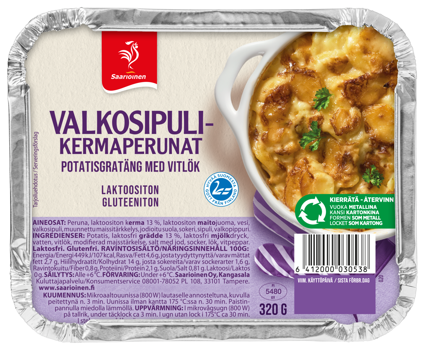 LaktoositonPaistoimme kuumassa uunissa tuoreista perunoista, valkosipulista ja kermaisesta kastikkeesta täyteläisen ja maukkaan perunalisäkkeen. Nämä kermaperunat sulavat suussa ja ne voi vaivatta lämmittää vuoassa uunissa tai vaikkapa grillissä. Saarioinen on Suomen luotetuin valmisruokamerkki.