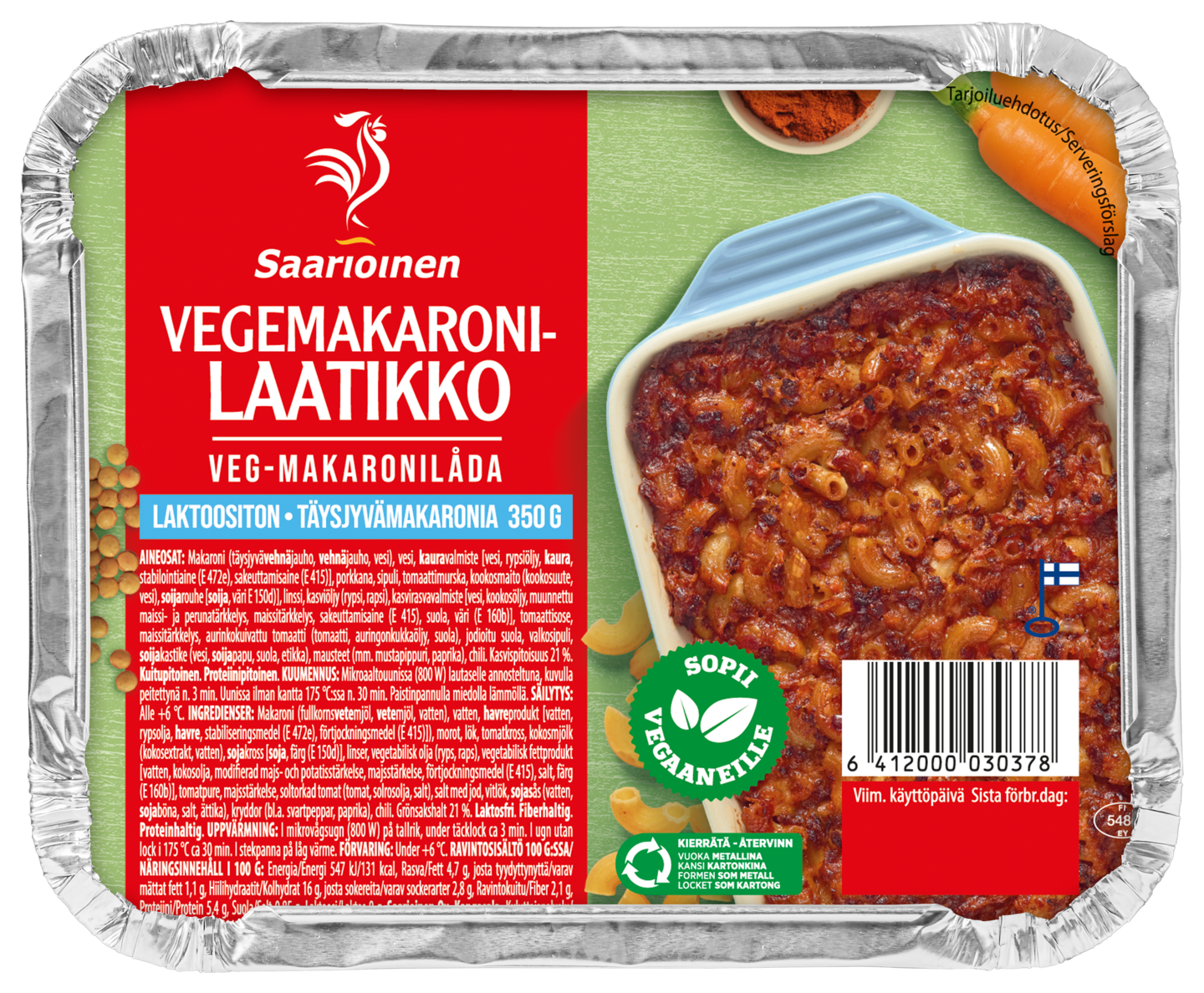 VegaaninenValmistimme täysjyväpastasta ja soijarouheesta täyteläisen vegaanisen makaronilaatikon, joka maistuu koko perheelle. Täyteläisyyttä makuun tuovat mm. kauravalmiste ja kookosmaito. Väriä ja samalla makua antavat porkkana, punaiset linssit ja aurinkokuivattu tomaatti. Meillä laatikon paistossa ei hätäillä, vaan pehmeän makuiset laatikot kypsyvät hitaasti uunissa paistajan valvovan silmän alla. Vegaaninen. Sopii vegaaneille. Saarioinen on Suomen luotetuin valmisruokamerkki.