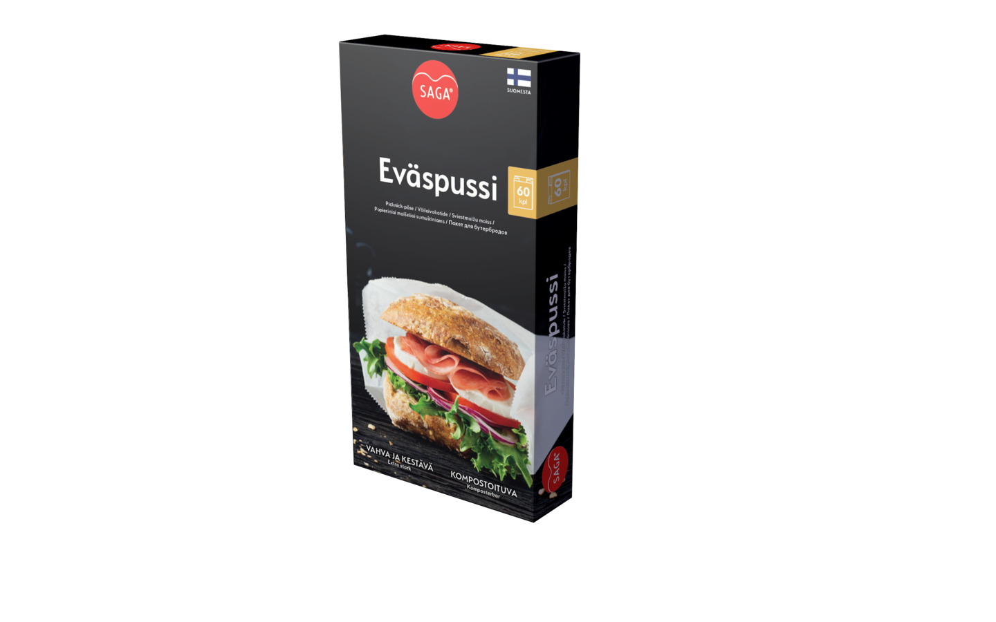 SAGA eväspussi on kätevä ja reilunkokoinen arjen monitoimityökalu: se soveltuu eväiden kääreeksi, ruoan käsittelyyn, säilytykseen, lämmitykseen ja tarjoiluun. Vahva paperi kestää repeämättä ja pitää ruoan raikkaana ilman muovipussien kosteutta.
