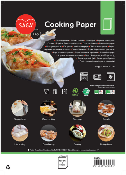 SAGA Ruoanlaittopaperi arkkeina annostelijapakkauksessa GN 1/1 arkin koko 32,5 x 53 cm 500 arkkia/la