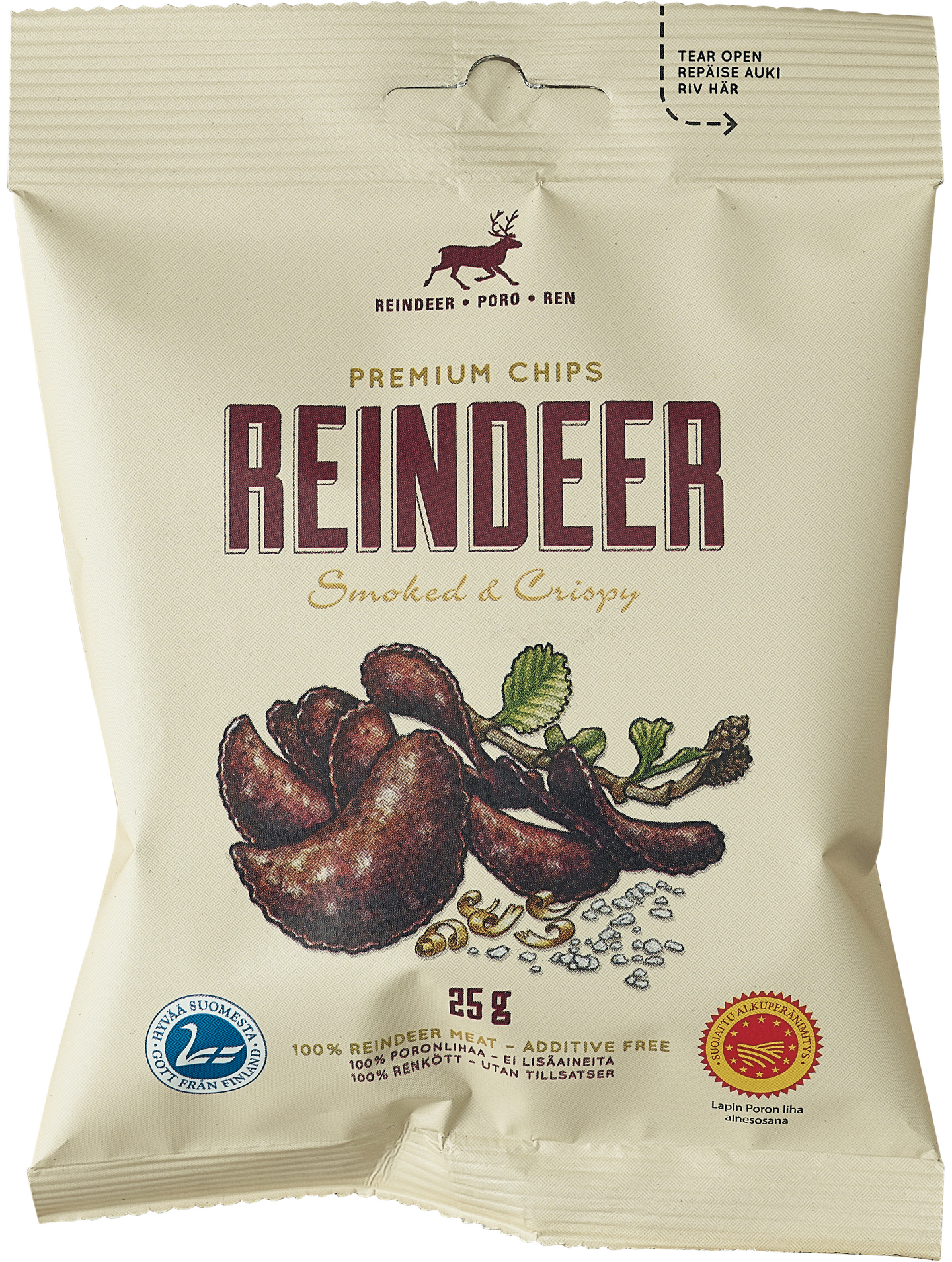 Lapin poron liha , suola (4,5%), mustapippuri, valkosipuli, kardemumma. Lakstoositon, gluteeniton ja lisäaineeton. Voimakassuolainen