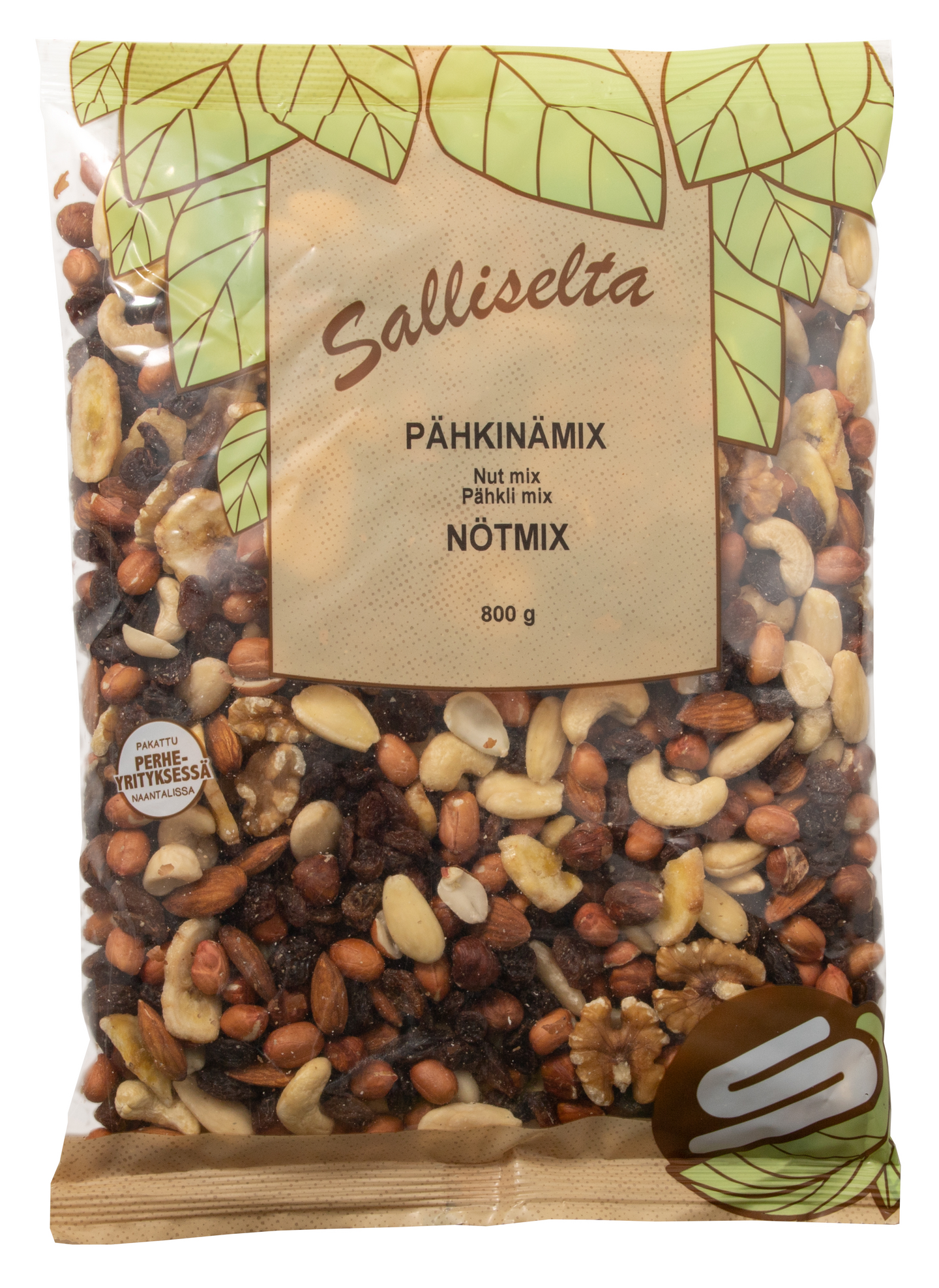 Pähkinämixistä saat samassa pussissa herkullisen lajitelman erilaisia pähkinöitä sekä kuivattuja hedelmiä. Valmistettu Suomessa.