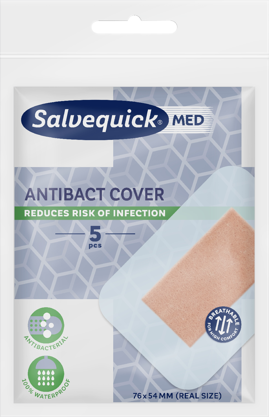 Salvequick MED 5kpl Antibact Cover laastari. Antibakteerinen ainesosa haavatyynyssä vähentää tulehdusriskiä. Täysin vedenpitävä, erittäin ohut ja hengittävä laastari. Nopeuttaa paranemista ja vähentää arpien muodostumisen riskiä. Laastari kiinnittyy hyvin kaikilla reunoilla olevan liimapinnan ansiosta. Sopii suuriin pintahaavoihin, kuten leikkaushaavoihin ja hiertymiin. CE-merkitty lääkinnällinen laite. CE 0413. Valmistaja: Orkla Care AB.