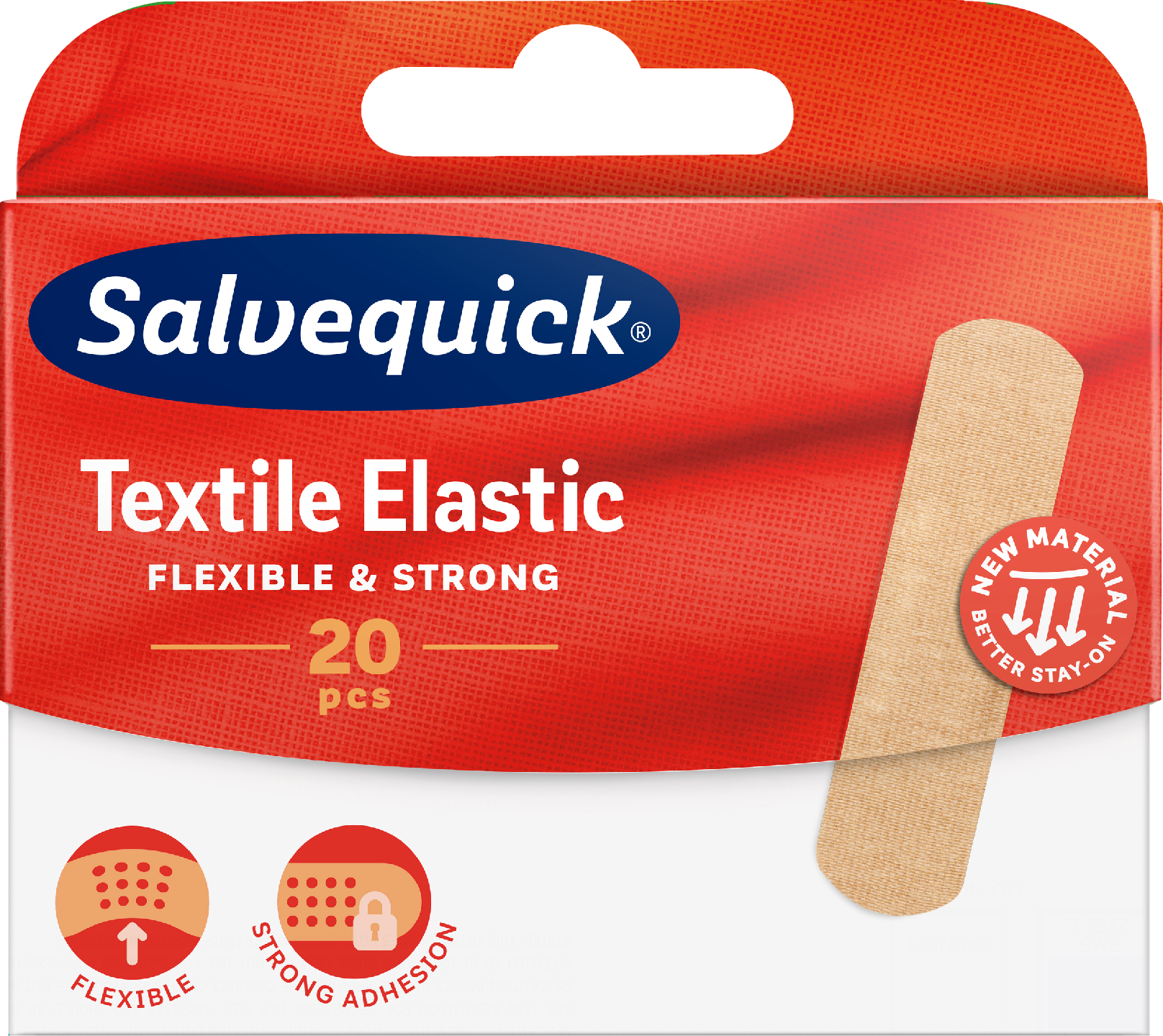 Salvquick Textile. Joustava laastari, joka kiinnittyy hyvin. Sopii kyynärpäihin, polviin ja niveliin. Hengittää ja suojaa haavaa lialta. 70 % laastarissa käytetyistä materiaaleista on uusiutuvia. Hypoallergeeninen. Puhdista haava ja varmista, ettei se ole tulehtunut. Vaihda laastari päivittäin. CE-merkitty lääkinnällinen laite. Valmistaja: Orkla Care AB.
