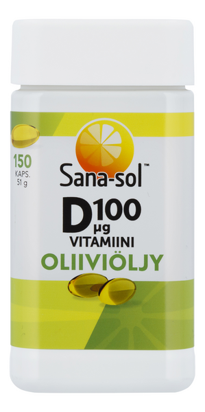 LaktoositonSana-sol D-vitamiinikapseli Oliiviöljy 100 μg on vahva D-vitamiinivalmiste, joka sisältää hyvin imeytyvää D3-vitamiinia ekstraneitsytoliiviöljyssä. Pienet kapselit on helppo niellä. D-vitamiini toimii luuston hyväksi, sillä se edistää kalsiumin imeytymistä. D-vitamiini edistää immuunijärjestelmän ja lihasten normaalia toimintaa. Laktoositon ja gluteeniton. Suositeltava vuorokausiannos aikuisille 1 kapseli vuorokaudessa. Purkki on valmistettu osittain kierrätysmuovista. Kierrätä muovina. Ravintolisä ei korvaa monipuolista ja tasapainoista ruokavaliota eikä terveitä elämäntapoja.
