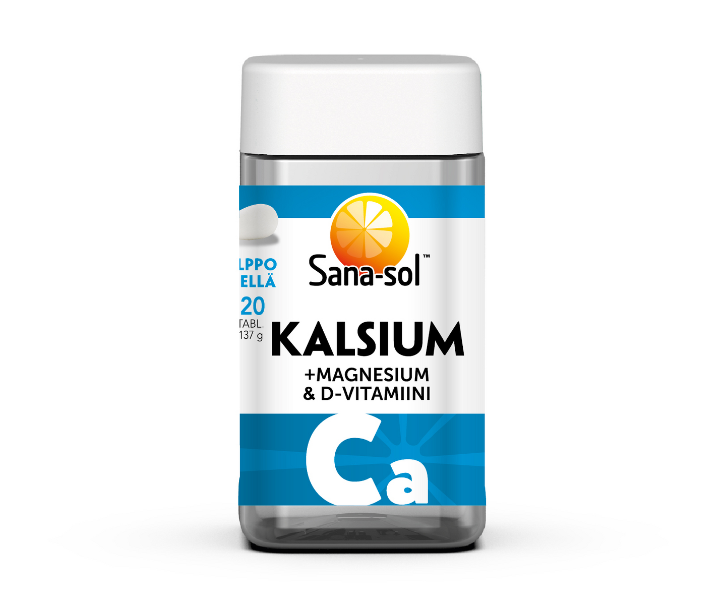 LaktoositonSana-sol Kalsium+magnesium+D sisältää hyvän yhdistelmän kalsiumia, magnesiumia ja D-vitamiinia helposti nieltävässä tabletissa. Tabletti on mantelinmuotoinen, minkä ansoista se on helpompi niellä kuin pyöreä tabletti. Tablettimuoto on kliinisesti testattu. Kalsium ja D-vitamiini ovat tarpeellisia luuston pysymiselle normaalina. Magnesium edistää lihasten normaalia toimintaa. Suositeltava vuorokausiannos aikuisille 3 tablettia vuorokaudessa. Laktoositon ja gluteeniton. Purkki on valmistettu osittain kierrätysmuovista. Kierrätä muovina. Ravintolisä ei korvaa monipuolista ja tasapainoista ruokavaliota eikä terveitä elämäntapoja.