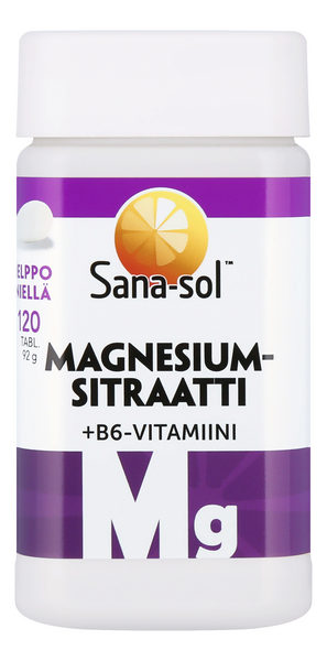 Magnesium (sitruunahapon magnesiumsuolat (94 %), magnesiumoksidi (6 %)), täyteaineet (mikrokiteinen selluloosa, silloitettu natriumkarboksimetyyliselluloosa, trikalsiumfosfaatti), pintakäsittelyaineet (rasvahappojen magnesiumsuolat, hydroksipropyylimetyyliselluloosa, polyetyleeniglykoli, karnaubavaha), väri (kalsiumkarbonaatti), B6-vitamiini (pyridoksiinihydrokloridi). Laktoositon ja gluteeniton.