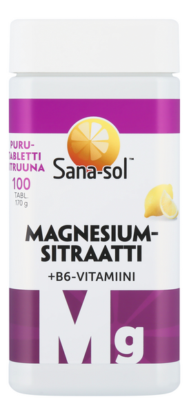 LaktoositonSana-sol Magnesiumsitraatti+B6 purutabletti sisältää hyvin imeytyvää magnesiumia sitraattimuodossa sekä B6-vitamiinia. Pureskeltava sitruunanmakuinen tabletti on hyvänmakuinen ja helposti nautittavassa muodossa. Magnesium edistää lihasten ja luuston normaalia toimintaa ja tukee myös elektrolyyttitasapainoa. B6-vitamiini edistää normaalia proteiini- ja glykogeeniaineenvaihduntaa sekä auttaa vähentämään väsymystä ja uupumusta. Laktoositon ja gluteeniton. Ei sisällä eläinperäisiä ainesosia. Sopii vegaaneille. Purkki on valmistettu osittain kierrätysmuovista. Kierrätä muovina. Ravintolisä ei korvaa monipuolista ja tasapainoista ruokavaliota eikä terveitä elämäntapoja.