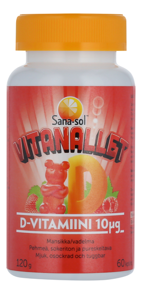 Sana-sol Vitanallet D-vitamiini on hyvänmakuinen, päivittäiseen käyttöön soveltuva D-vitamiinilisä pehmeässä ja pureskeltavassa muodossa koko perheelle 3-vuotiaasta alkaen. Päiväannoksessa (1 kpl) on 10 µg D-vitamiinia. Vitanallet ovat mansikan-/vadelmanmakuisia. Sokeriton. D-vitamiini toimii luuston hyväksi, sillä se edistää kalsiumin imeytymistä. D-vitamiini edistää immuunijärjestelmän ja lihasten normaalia toimintaa. Sitä tarvitaan myös solujen jakautumiseen. Ravintolisä ei korvaa monipuolista ja tasapainoista ruokavaliota eikä terveitä elämäntapoja.