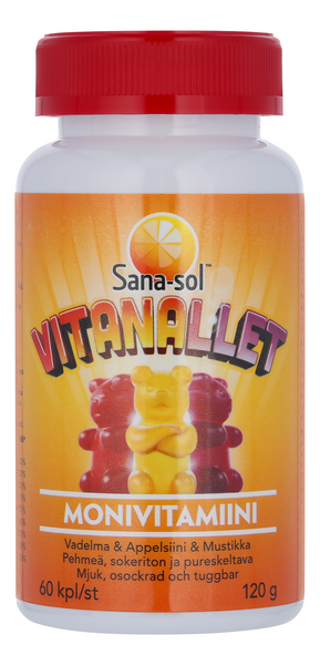 Sana-sol Vitanallet monivitamiini 60kpl vadelman-, appelsiinin- ja mustikanmakuinen