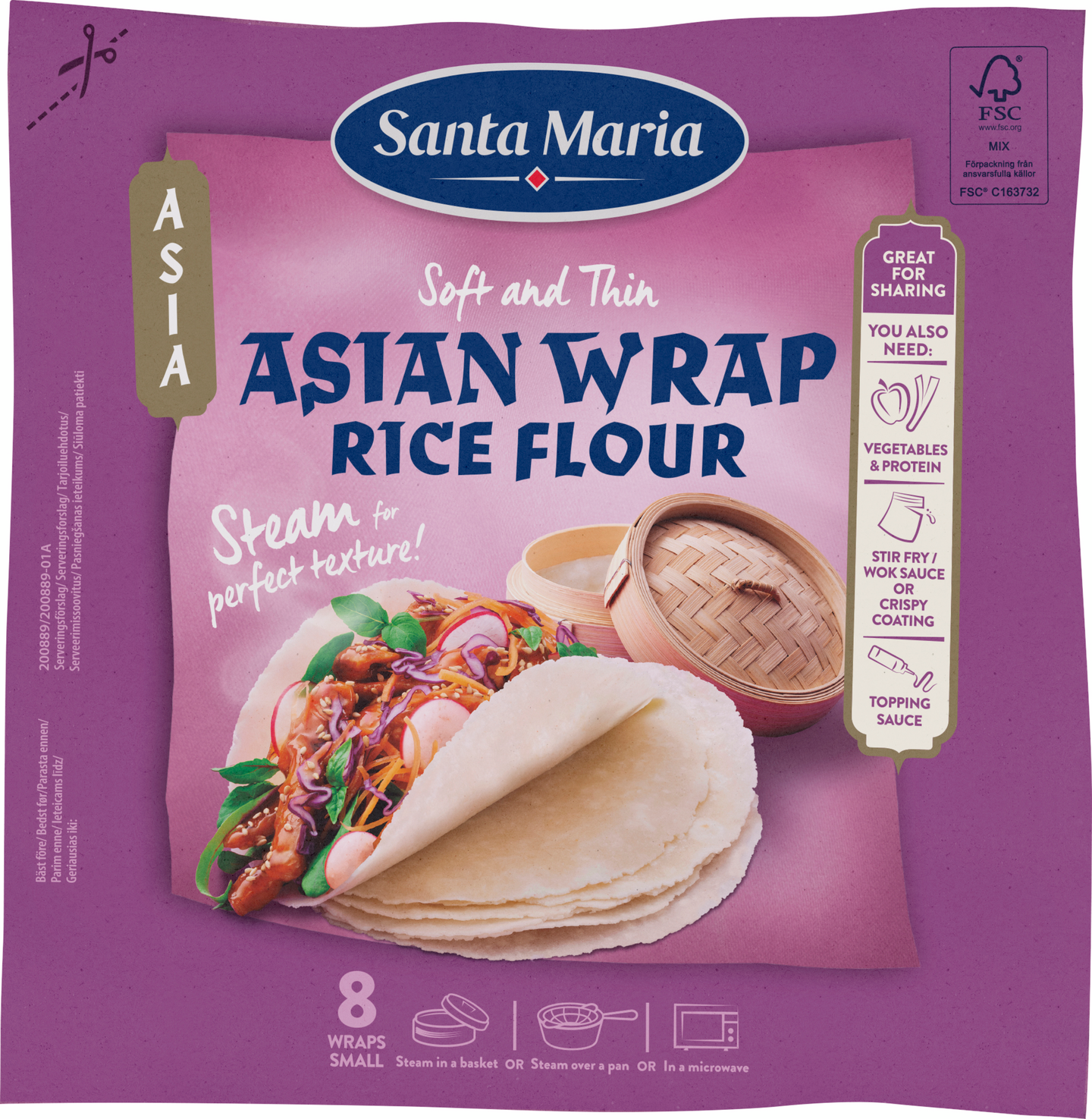 VegaaninenAsian Wrap Rice Flour & Wheat -tuotteella valmistat helposti kotona aasialaisia tacoja! Asian Wrapit valmistat helposti höyryttämällä bambukorissa tai teräksisessä siivilässä 2 minuutin ajan tai kunnes ne ovat lämpimiä. Voit valmistaa Asian Wrapit myös lämmittämällä mikroaaltouunissa minuutin ajan. Täytä aasialaiset wrapit maustetulla kanalla, tofulla tai sienillä, haluamillasi vihanneksilla, kuten salaatilla, raastetulla porkkanalla, retiiseillä ja kevätsipulilla sekä herkullisella maustekastikkeella, korianterilla ja seesaminsiemenillä. Kutsu ystävät ja perhe maistamaan jotain herkullista, uutta ja jännittävää: aasialaisia tacoja! Sopii erinomaisesti jaettavaksi! Kokeile myös: Crispy Coating Garlic Ginger tai Stir Fry Sauce Sweet Chili & Garlic, Topping Sauce Sweet Korean BBQ tai Topping Sauce Hot Kimchi Style, Topping Sauce Sesame & Soy Mayo tai Topping Sauce Sweet Chili Mayo.