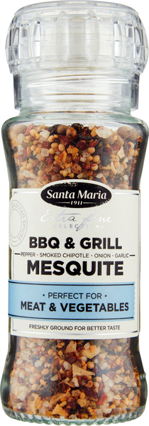 VegaaninenSanta Maria BBQ & Grill Mesquite on kätevä mausteseos, joka saa savuisen grillimakunsa mesquite-puusta yhdessä valkosipulin, mustapippurin ja Välimeren suolan kanssa. Santa Maria BBQ & Grill on täydellinen grillatulle lihalle, kanalle, vihanneksille ja kalalle. Tämä pippurimylly on kätevä kumppani grillin ääressä, mutta se toimii yhtä hyvin myös pöytämausteena.