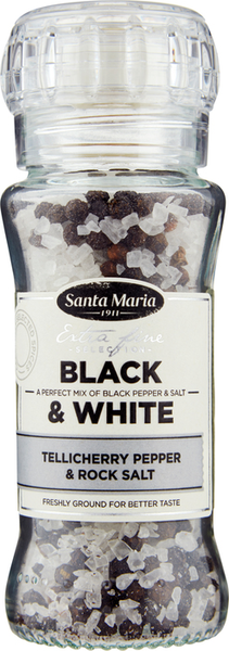 VegaaninenSanta Maria Black & White on kätevä maustemylly, joka yhdistää parhaan mustapippurin ja korkealaatuisen vuorisuolan. Muutama pyöräytys tällä pippurimyllyllä vapauttaa hienon vuorisuolan miedon suolaisuuden yhdessä Tellicherry Garbled Special Extra Bold -pippurin hedelmäisen aromin kanssa. Santa Maria Black & White on kätevä pippurimylly, joka on yhtä hyödyllinen keittiössä, grillin äärellä sekä pöytämausteena.