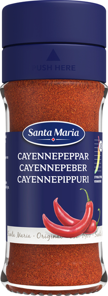 VegaaninenLaadukasta cayennepippuria. Cayennepippuri on hieman tulisempi kuin tavallinen chilipippuri ja voi enemmän käytettynä lisätä ruoan tulisuutta huomattavasti. Santa Maria Cayenne -pippuri valmistetaan Capsicum Anuum -lajikkeen chileistä. Tämän cayennepippurin tulisuus on välillä 20 000 – 30 000 scovillea.