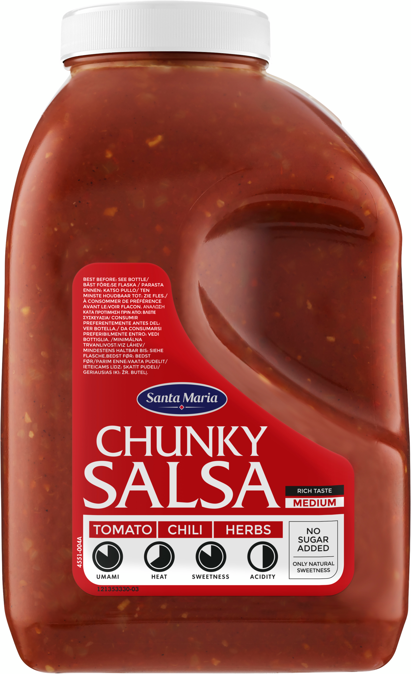 VegaaninenSanta Marian medium-tulinen meksikolainen tomaattikastike, jossa on kokonaisia tomaatin, chilin, jalapeñon ja sipulin paloja. Sopii meksikolaisiin ruokiin sekä täyteläisiin kastikkeisiin hampurilaisten, laatikkoruokien, paahtopaistin ja jauhelihan kanssa.