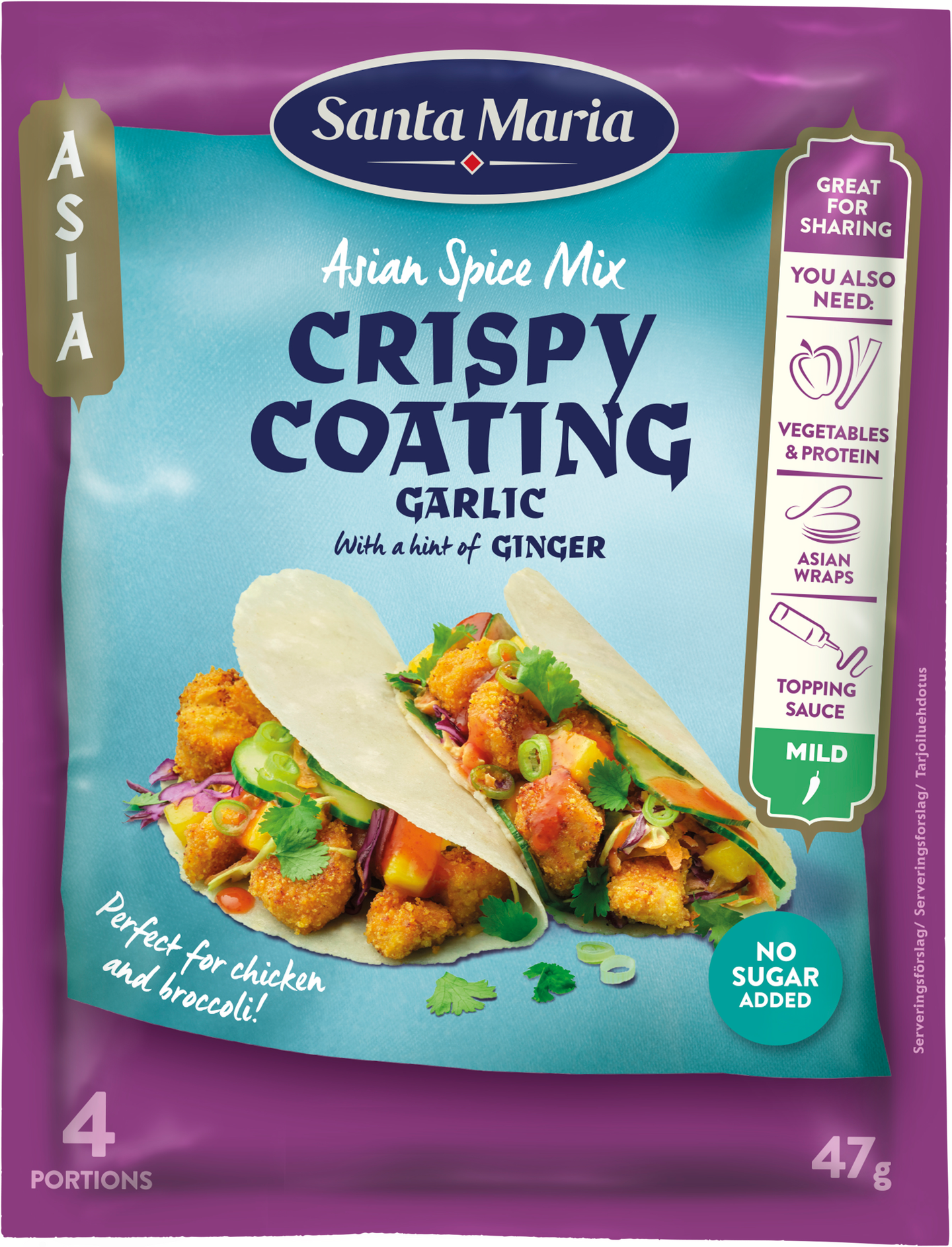 VegaaninenCrispy Coating Garlic Ginger -mausteseoksen avulla valmistat helposti kotona rapeita suupaloja aasialaisiin tacoihisi! Crispy Coating Garlic Ginger on herkullisen valkosipulinen ja kevyen inkiväärinen panerointiseos, joka antaa täydellisen maun ja rapeuden kanalle tai parsakaalille. Kypsennä airfryerissa tai uunissa 10–15 minuutin ajan tai kunnes pinta on kullanruskea. Tarjoile rapea kana tai parsakaali höyrytettyjen aasialaisten wrappien kanssa, ja lisää haluamiasi vihanneksia, kuten salaattia, raastettua porkkanaa, retiisejä ja kevätsipulia sekä herkullista maustekastiketta, korianteria ja seesaminsiemeniä. Kutsu ystävät ja perhe maistamaan jotain herkullista, uutta ja jännittävää: aasialaisia tacoja! Sopii erinomaisesti jaettavaksi!