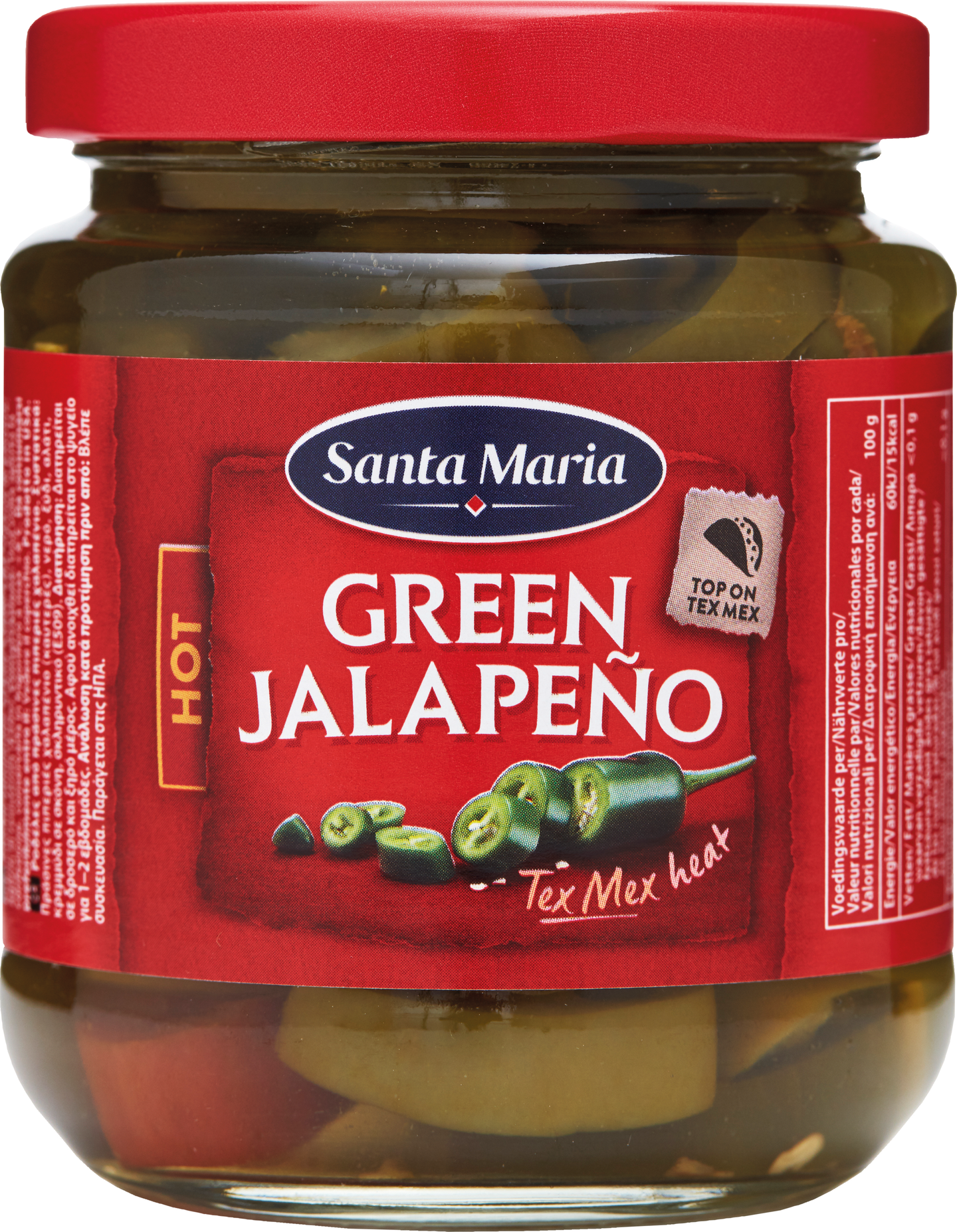 VegaaninenSanta Maria Green Jalapeño sisältää meksikolaista vahvaa chilipippuria ja antaa herkullisen maun ja juuri sopivan potkun kaikkiin texmexruokiin. Jalapeño on varmasti yksi maailman suosituimmista mausteista, kiitos sen pehmeän mausteisuuden. Santa Maria Green Jalapeño antaa lisämakua ja väriä kaikkeen texmexiin – tacoihin, quesadilloihin, burritoihin, nachoihin, tostadoihin, hampurilaisiin, pizzoihin ja tortillapizzoihin.