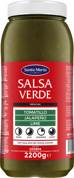 VegaaninenSanta Maria Salsa Verde on mehukas tomatillo-salsa, jossa on kirpeää limettiä, vihreitä jalapeñoja ja hienovaraista katkeruutta. Salsassa on puolipehmeä rakenne, jossa on pieniä vihanneksia ja tomatillon siemeniä. Salsan makuprofiili on pehmeä ja kasvillinen, kuten avokadon miedot vivahteet. Salsa on vain hieman tulinen ja miellyttävän mausteinen. Tämä salsa sopii erinomaisesti monenlaisten ruokien kanssa – quesadilloista ja birria-tacoista mereneläviin ja nuggetteihin. Tämä salsa sopii myös täydellisesti juuston ja vihannesten, kuten kukkakaalin ja parsan, kanssa. Salsa sopii tarjottavaksi täytteenä tai dippinä kaikille asiakkaille, koska se on kasvipohjainen ja gluteeniton kastike.