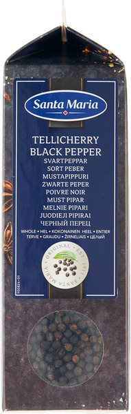 VegaaninenSanta Maria mustapippurilla, jota saadaan tunnetulta Tellicherryn alueelta Intiasta, on ihastuttavan hedelmäinen vahvuus, joka lisää sen aromaattista makua. Miellyttävän tulisena se sopii hyvin kaikentyyppiseen ruoanlaittoon ja maistuu parhaalta vastajauhettuna.