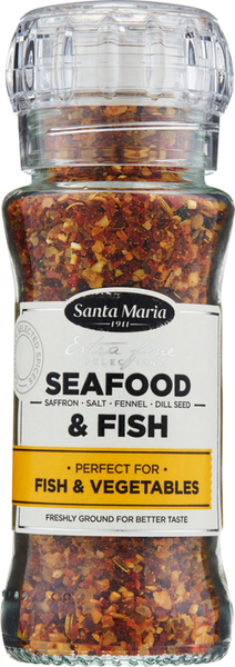 VegaaninenKätevä maustemylly, jossa on huolella valittuja makuja kalaruoille ja muille meren antimille. Santa Maria Seafood & Fish maustaa ruoan upeasti aromikkaalla yhdistelmällä sahramia, tillinsiemeniä, fenkolia ja valkosipulia. Pippurimylly, joka helpottaa merenelävien maustamista, mutta sopii myös riisiruokiin, kuskusiin, kastikkeisiin ja maustevoihin.
