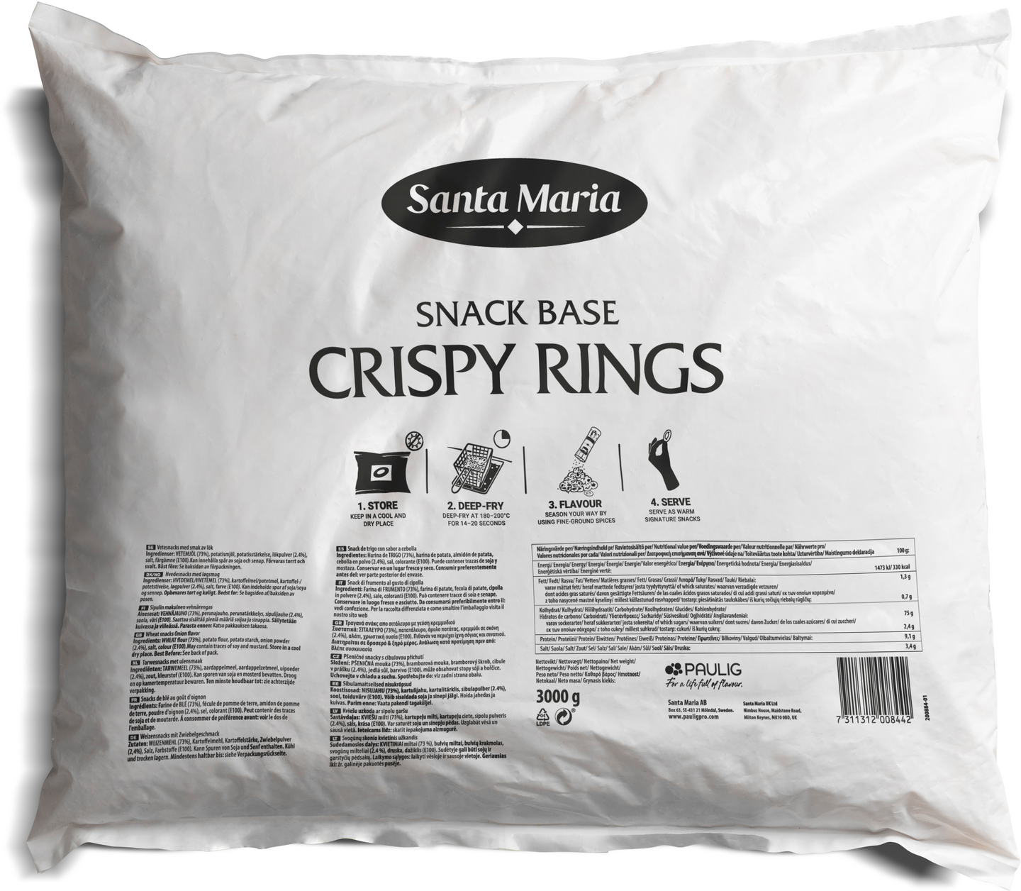 VegaaninenSanta Maria Snack Base Crispy Rings -snackpohjien avulla on helppo luoda ainutlaatuisia, tuoreita snacks-annoksia. Frittaa snackpohjat nopeasti, mausta kuten haluat ja tarjoa lämpiminä snackseinä juomien ja dippikastikkeiden kanssa. Ne ovat myös loistava lisuke ranskanperunoiden sijaan ja täydellinen salaatin lisuke.
