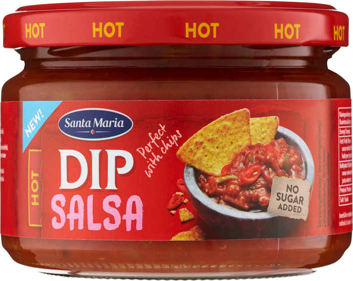 VegaaninenSanta Maria Salsa Dip Hot on meksikolainen texmex-dippikastike. Herkullinen tomaatin, sipulin, chilin ja jalapeñojen makuinen salsa. Santa Maria Salsa Dip Hot antaa erinomaista texmexin makua sipseihin, nachoihin, tortillalastuihin ja kasvistikkuihin. Santa Maria Salsa Dip Hot sopii mainiosti myös tacojen, quesadillojen, tostadojen ja tortillapizzojen täytteeksi.