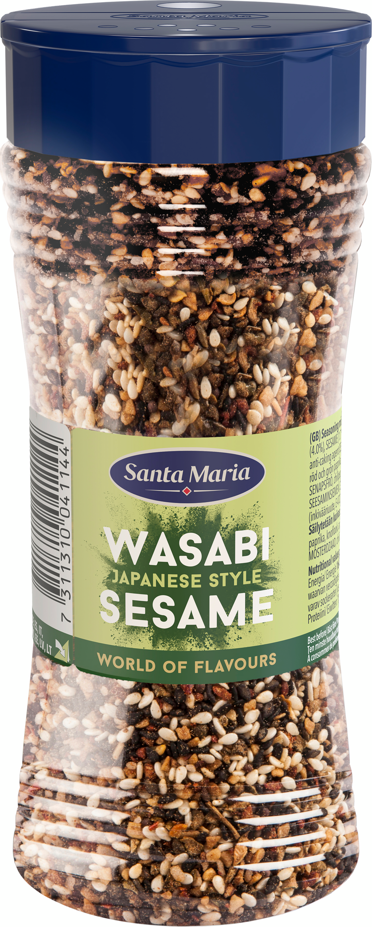 SEESAMINsiemenet (39%), merisuola, punainen ja vihreä paprika, valkosipuli, aromi (wasabi), inkivääriuute, piparjuuri (2,5%), SINAPINSIEMEN, chilipippuri, luontainen aromi (seesami), paakkuuntumisenestoaine (E551).