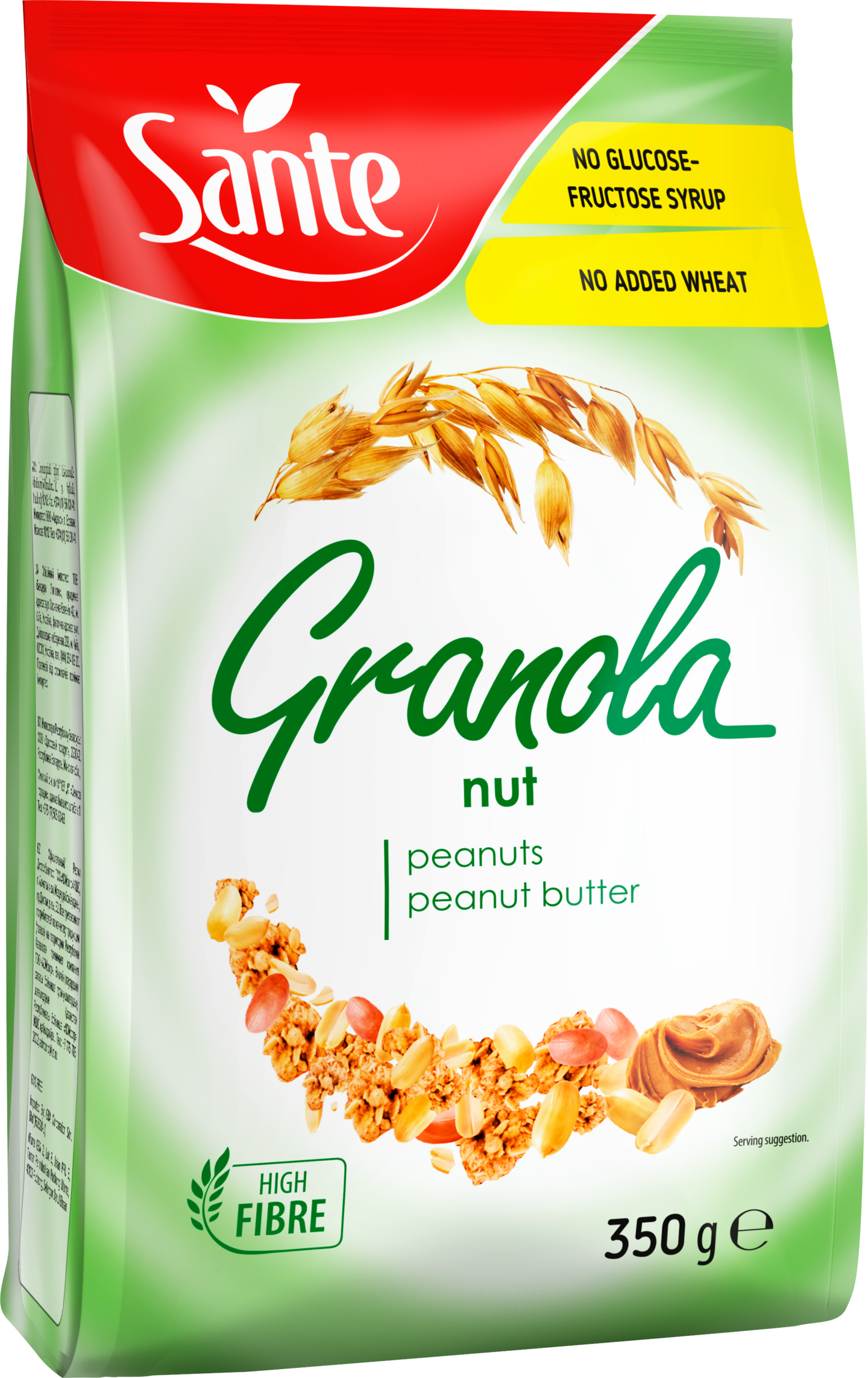 Sante Pähkinägranola on poikkeuksellisen herkullinen ja rapea, jopa keksimäisen makuinen yhdistelmä paahdettua täysjyväkauraa (36,5%), maapähkinöitä ja maapähkinävoita.