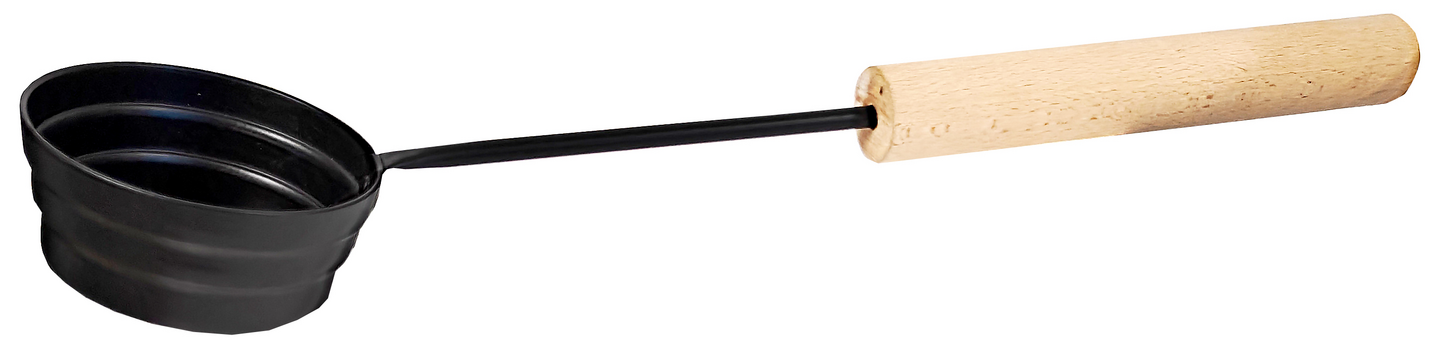 Alumiinista valmistettu löylykauha jossa on pyökkinen kahva.