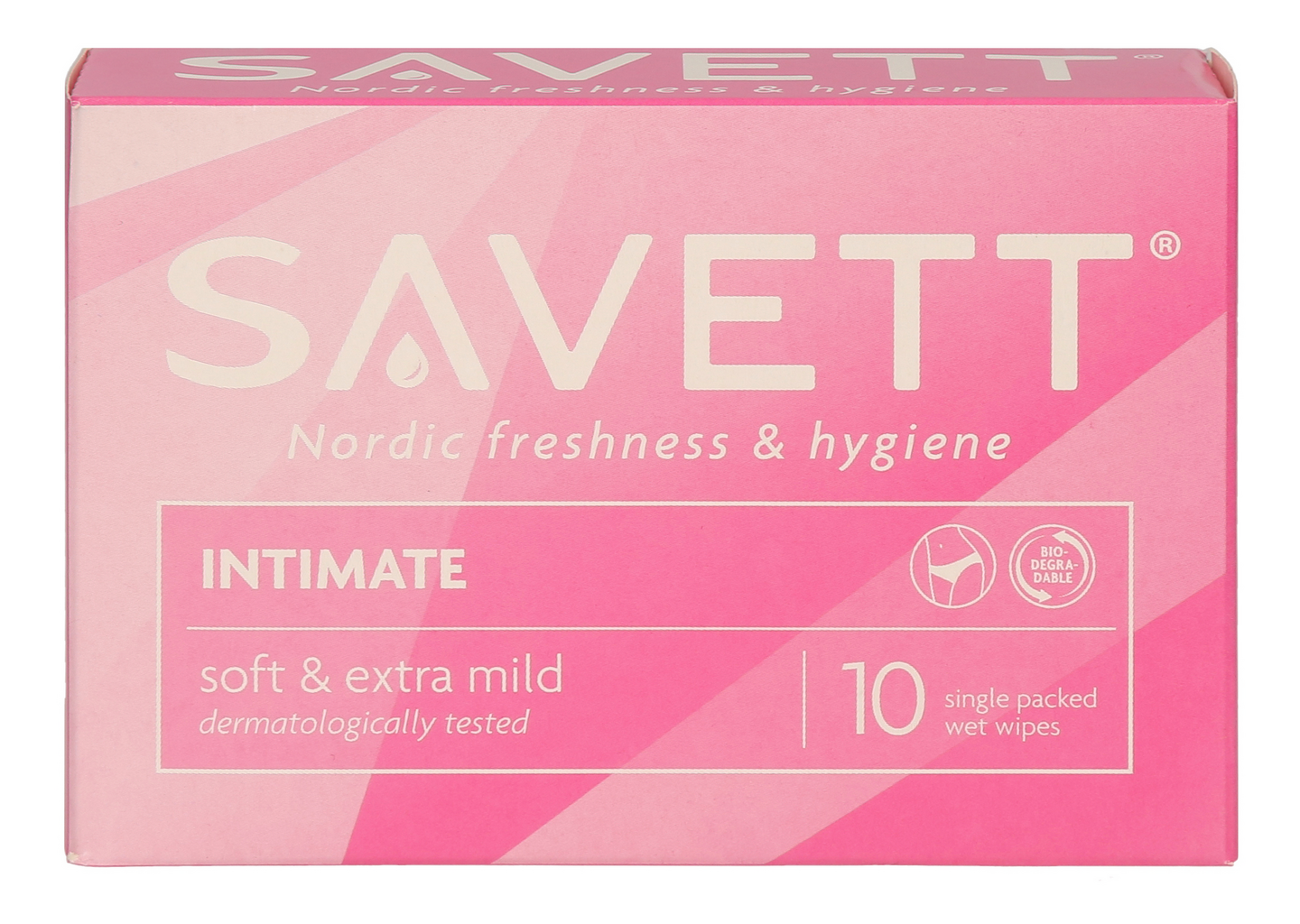 Savett Intimate on pehmeä ja erittäin hellävarainen kosteuspyyhe intiimialueiden puhdistukseen. Kosteuspyyhe on hajusteeton ja sen ihoystävällinen pH-arvo auttaa säilyttämään ihon luonnollisen kosteustasapainon. Yksittäispakatut pyyhkeet on helppo ottaa mukaan. Kosteuspyyhe on biologisesti hajoava. Älä heitä kosteuspyyhettä WC-pönttöön. Valmistettu Suomessa. Dermatologisesti testattu.