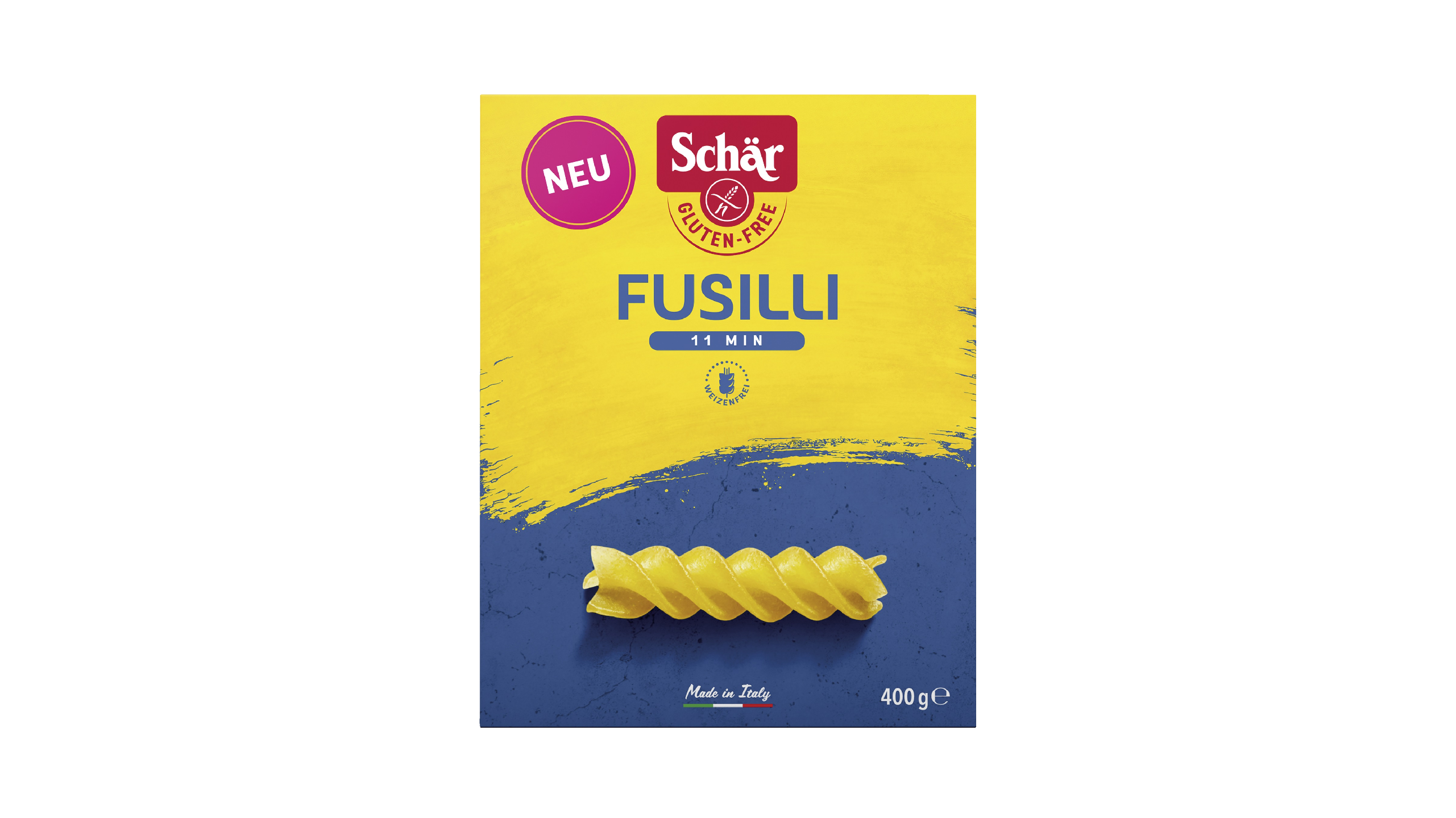 Schär Fusilli on aito italialainen pasta ja klassikko lautasella. Sopii hyvin kaikenlaisten kastikkeiden kanssa: "all'arrabbiata", pesto tai vain oliiviöljyn ja parmesaanijuuston kera. Gluteeniton, vehnätön, laktoositon. Ilman lisättyä maitoa, munia, palmuöljyä tai säilöntäaineita. Saattaa sisältää jäämiä soijasta.