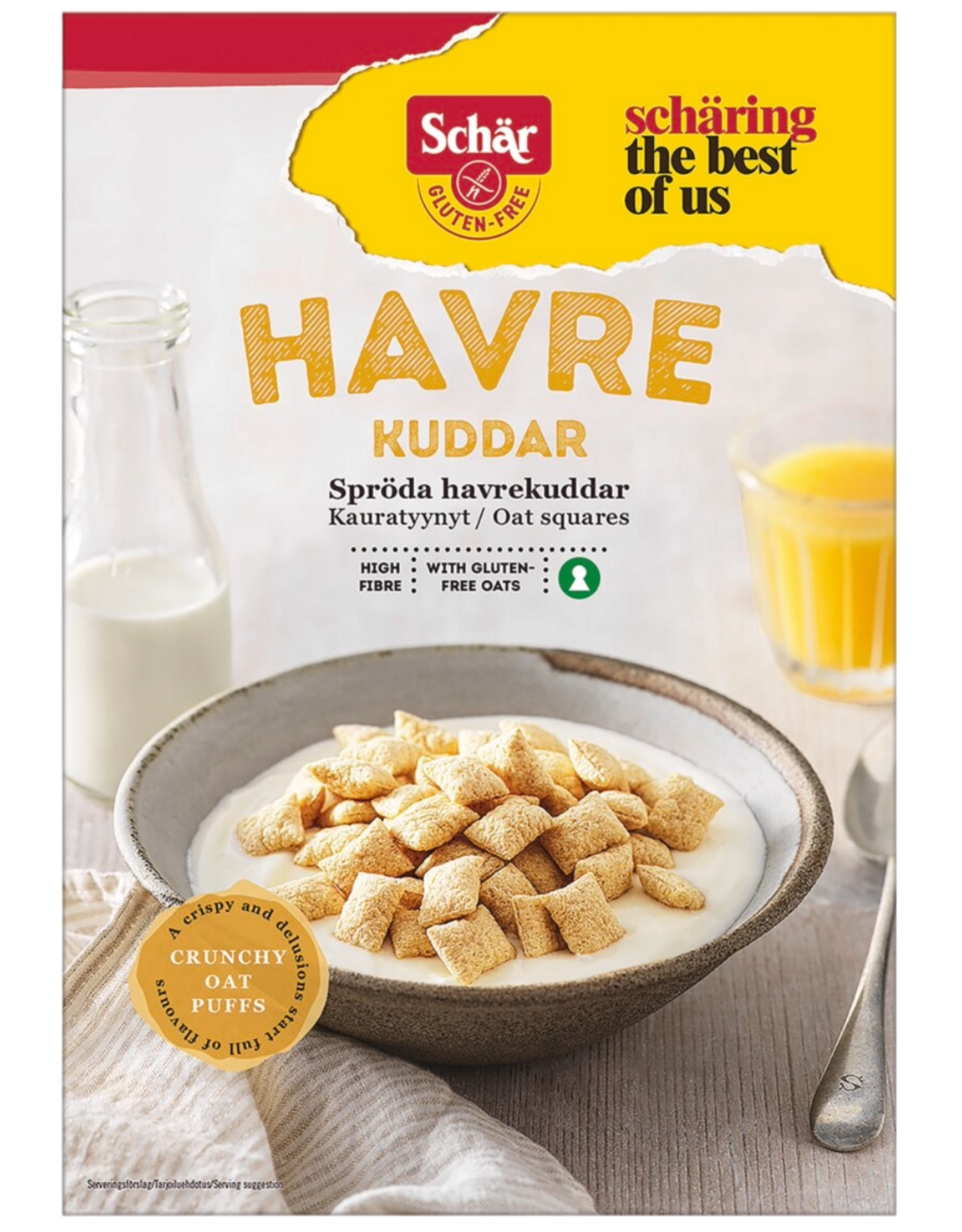 Schär Kauratyynyt ovat rapeita gluteenittomia tyynyjä, jotka on valmistettu gluteenittomasta täyskaurasta ja maissista. Runsaskuituiset murot sopivat erinomaisesti aamupalakulhoon suosikkijogurtin kanssa.